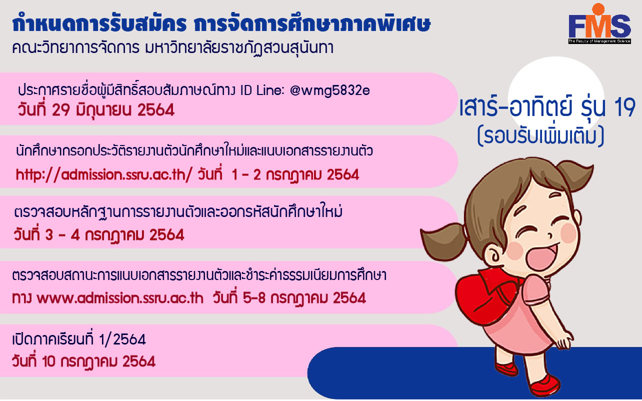กำหนดการรับสมัครนักศึกษา การจัดการศึกษาภาคพิเศษ (เสาร์-อาทิตย์) รุ่น 19 รอบรับเพิ่มเติม คณะวิทยาการจัดการ มหาวิทยาลัยราชภัฏสวนสุนันทา ประจำปีการศึกษา 2564