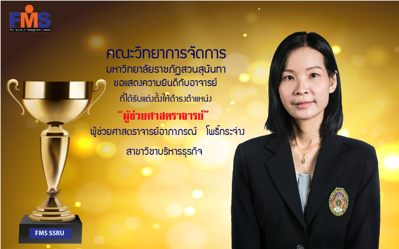 คณะวิทยาการจัดการ มหาวิทยาลัยราชภัฏสวนสุนันทา ขอแสดงความยินดีกับผู้ช่วยศาสตราจารย์อาภาภรณ์ โพธิ์กระจ่าง เนื่องในโอกาสที่สภามหาวิทยาลัยราชภัฏสวนสุนันทา ในคราวประชุมครั้งที่ 6 / 2564 วันที่ 30 มิถุนายน 2564 มีมติอนุมัติแต่งตั้งให้ดำรงตำแหน่งทางวิชาการที่สูงขึ้น "ผู้ช่วยศาสตราจารย์" สาขาวิชาบริหารธุรกิจ
