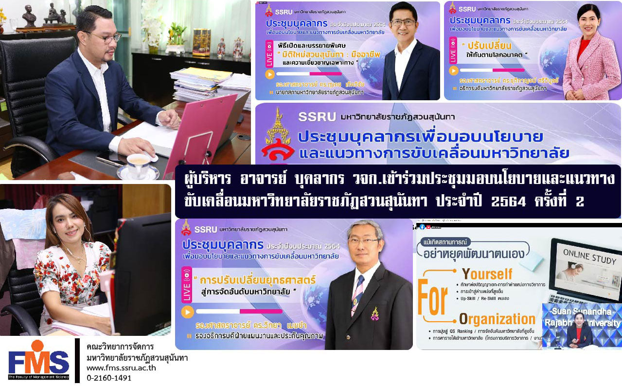 วันที่ 9 กรกฎาคม 2564   มหาวิทยาลัยราชภัฏสวนสุนันทา จัดประชุมมอบนโยบาย และแนวทางขับเคลื่อนมหาวิทยาลัยฯ  ประจำปี 2564 ครั้งที่ 2  โดยคณะผู้บริหารมหาวิทยาลัยราชภัฏสวนสุนันทา นำโดยรองศาสตราจารย์ ดร. ฤๅเดช  เกิดวิชัย  นายกสภามหาวิทยาลัยราชภัฏสวนสุนันทา  รองศาสตราจารย์ ดร. ชุติกาญจน์ ศรีวิบูลย์ อธิการบดี  พร้อมด้วยรองอธิการบดีแต่ละฝ่าย  มอบนโยบายต่อคณาจารย์และบุคลากรสายสนับสนุนวิชาการของมหาวิทยาลัย  ในการนี้ผู้ช่วยศาสตราจารย์ ดร.สมศักดิ์ คล้ายสังข์ คณบดีคณะวิทยาการจัดการ พร้อมด้วยคณะผู้บริหาร รองคณบดี อาจารย์ หัวหน้าสำนักงานคณบดี บุคลากรสายวิชาการและสายสนับสนุนวิชาการ เข้าร่วมประชุมรับนโยบาย   ในรูปแบบการประชุมออนไลน์