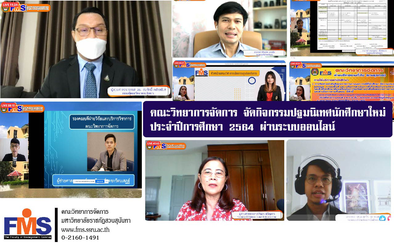 วันที่ 12 กรกฎาคม 2564 คณะวิทยาการจัดการ มหาวิทยาลัยราชภัฏสวนสุนันทา จัดกิจกรรมปฐมนิเทศนักศึกษาใหม่ ประจำปีการศึกษา 2564 ในรูปแบบออนไลน์การ live สด ผ่านทาง Facebook fanpage : คณะวิทยาการจัดการ มหาวิทยาลัยราชภัฏสวนสุนันทา เพื่อลดความเสี่ยงและป้องกันการแพร่ระบาดของโรคติดเชื้อไวรัสโคโรนา 2019 (COVID-19) โดยผู้ช่วยศาสตราจารย์ ดร.สมศักดิ์ คล้ายสังข์ คณบดีคณะวิทยาการจัดการ พร้อมด้วยคณะผู้บริหาร รองคณบดีทุกฝ่าย กล่าวต้อนรับพร้อมให้โอวาท และสร้างความเข้าใจแก่นักศึกษาเกี่ยวกับการจัดเรียนการสอนในสถานการณ์ COVID – 19 การแนะนำงานกิจกรรมพัฒนานักศึกษา สวัสดิการนักศึกษา การใช้ชีวิตในรั้วมหาวิทยาลัย การแนะนำอาจารย์หัวหน้าสาขา หัวหน้าแขนงวิชา การแนะนำฝ่ายต่างๆของคณะ รวมทั้งช่องทางการติดต่อและการเผยแพร่ข้อมูลข่าวสารของคณะฯ เพื่อให้นักศึกษาใหม่ทุกคนได้รู้จักคณะวิทยาการจัดการมากขึ้น