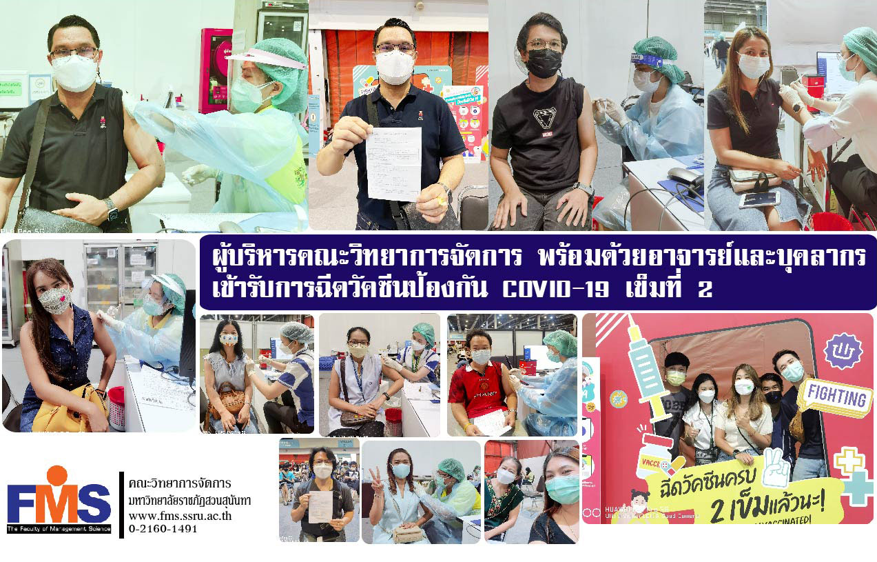 สำหรับการดำเนินการฉีดวัคซีนของบุคลากรประจำคณะเป็นไปด้วยความเรียบร้อย บุคลากรเข้ารับการฉีดวัคซีนเข็มที่ 2 ครบถ้วน ในโอกาสนี้ทางคณะวิทยาการจัดการ ขอขอบคุณผู้บริหาร มหาวิทยาลัยราชภัฏสวนสุนันทา รองศาสตราจารย์ ดร. ชุติกาญจน์ ศรีวิบูลย์ อธิการบดี รวมทั้งผู้ประสานงานที่เกี่ยวข้องที่ได้ให้ความอนุเคราะห์ ในการสนับสนุนและห่วงใยด้านสวัสดิภาพของบุคลากร ทั้งนี้เพื่อเตรียมความพร้อม ในการให้บริการสำหรับคณาจารย์ นักศึกษา และผู้เข้ารับบริการของคณะวิทยาการจัดการและมหาวิทยาลัยต่อไป