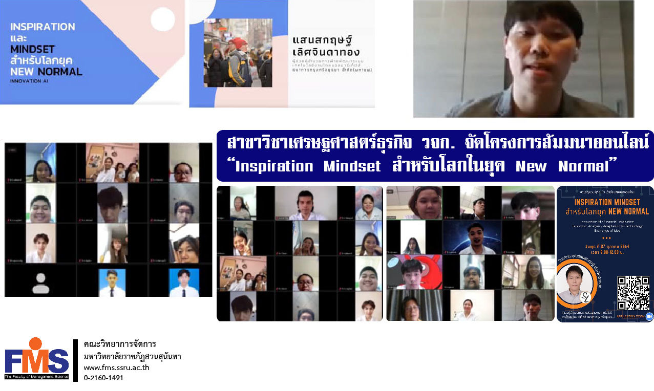 เมื่อเร็วๆนี้ นักศึกษาสาขาวิชาเศรษฐศาสตร์ธุรกิจ ชั้นปีที่ 4 ภาคปกติ คณะวิทยาการจัดการ มหาวิทยาลัยราชภัฏสวนสุนันทา จัดโครงการสัมมนาออนไลน์ ในหัวข้อ “Inspiration Mindset สำหรับโลกในยุค New Normal” ซึ่งได้รับเกียรติจากแสนสกฤษฐ์ เลิศจินดาทอง ตำแหน่ง ผู้ช่วยผู้อำนวยการฝ่ายพัฒนาระบบเทคโนโลยี ธนาคารกรุงศรีอยุธยา จำกัด (มหาชน) เป็นวิทยากรให้ความรู้กับนักศึกษา อาจารย์ประจำสาขา และผู้สนใจ ในรูปแบบการประชุมผ่านแอพพลิเคชัน Zoom