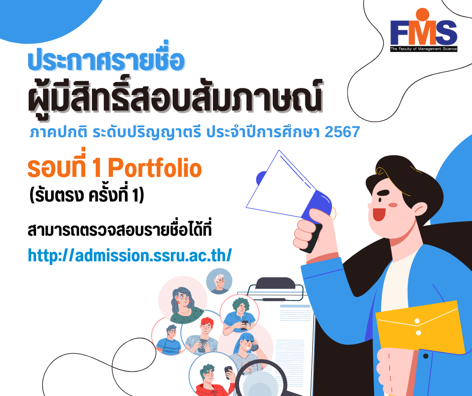 ประกาศรายชื่อผู้มีสิทธิ์สอบสัมภาษณ์ ภาคปกติ ระดับปริญญาตรี ประจำปีการศึกษา 2567 (รอบที่ 1 Portfolio) รับตรง ครั้งที่ 1