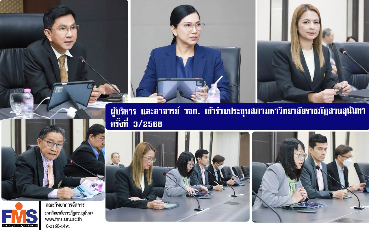 วันที่ 26 มีนาคม 2568 ผู้ช่วยศาสตราจารย์ ดร.ชุติมา คล้ายสังข์ คณบดีคณะวิทยาการจัดการ พร้อมด้วย อาจารย์ ดร.ยุทธภูมิ ธนากิจบริสุทธิ์ รองคณบดีฝ่ายวิชาการ ผู้ช่วยศาสตราจารย์ ดร.ศิริวรรณ ศักดิ์สิริฤทัย หัวหน้าสาขาวิชาเศรษฐศาสตร์ธุรกิจ ผู้ช่วยศาสตราจารย์ ดร.สมภูมิ แสวงกุล อาจารย์ประจำสาขาวิชาเศรษฐศาสตร์ธุรกิจ อาจารย์ ดร.อโนชา โรจนพานิช หัวหน้าสาขาวิชาการบัญชี และ อาจารย์ ดร.สุภาพ อัครปทุมวงศ์ อาจารย์ประจำสาขาวิชาการบัญชี เข้าร่วมประชุมสภามหาวิทยาลัย ครั้งที่ 3/2568 เพื่อนำเสนอวาระการประชุม การปรับปรุงหลักสูตรเศรษฐศาสตร์บัณฑิต สาขาวิชาเศรษฐศาสตร์ธุรกิจ หลักสูตรปรับปรุง พ.ศ. 2569 และการปรับปรุงหลักสูตรบัญชีบัณฑิต หลักสูตรปรับปรุง พ.ศ.2569 โดยรองศาสตราจารย์ ดร.ฤๅเดช เกิดวิชัย นายกสภามหาวิทยาลัยราชภัฏสวนสุนันทา เป็นประธานการประชุม พร้อมด้วยรองศาสตราจารย์ ดร.ชุติกาญจน์ ศรีวิบูลย์ อธิการบดีมหาวิทยาลัยราชภัฏสวนสุนันทา โดยมีคณะกรรมการสภามหาวิทยาลัยเข้าร่วมประชุม เพื่อพิจารณาให้ความเห็นชอบและเสนอแนะประเด็นพิจารณาในวาระต่างๆ เพื่อการบริหารและขับเคลื่อนมหาวิทยาลัย ณ ห้องประชุมสภามหาวิทยาลัย อาคาร 31 ชั้น 5 พร้อมกับการประชุมในรูปแบบออนไลน์ (Google Meet)