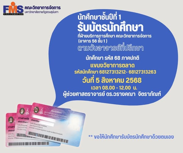 นักศึกษาชั้นปีที่ 1 รับบัตรนักศึกษา ที่ฝ่ายบริการการศึกษา คณะวิทยาการจัดการ (อาคาร 56 ชั้น 1 ) ตามวันอาจารย์ที่ปรึกษา