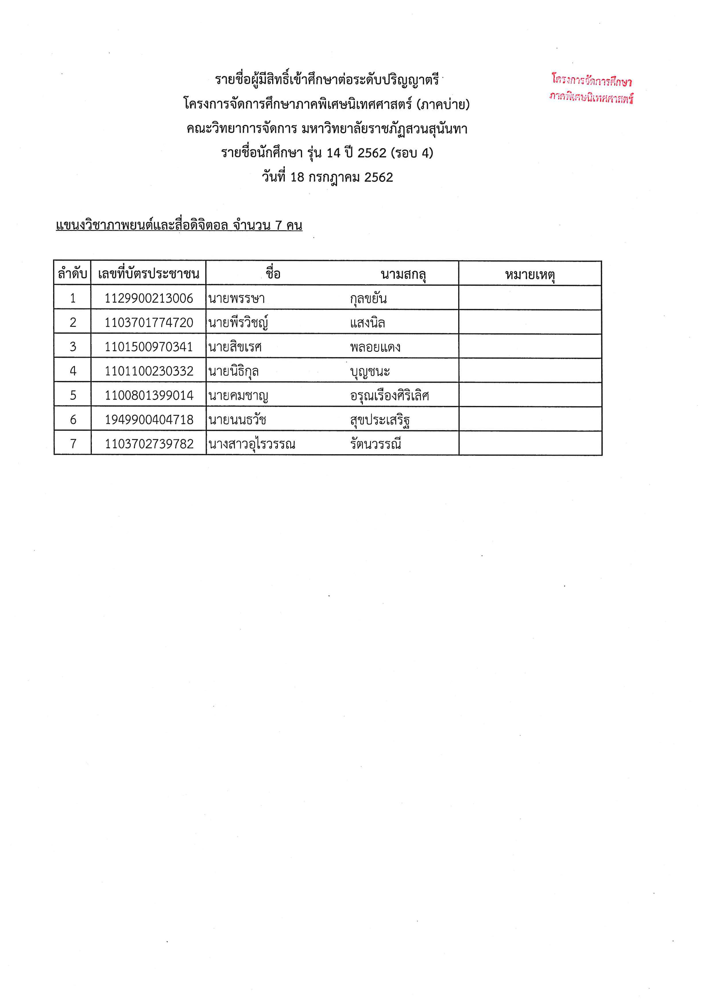 ประกาศรายชื่อผู้มีสิทธิ์เข้าศึกษาต่อระดับปริญญาตรี โครงการจัดการศึกษาภาคพิเศษนิเทศศาสตร์ (ภาคบ่าย) รุ่น 14 ปี 2562 (รอบ 3)