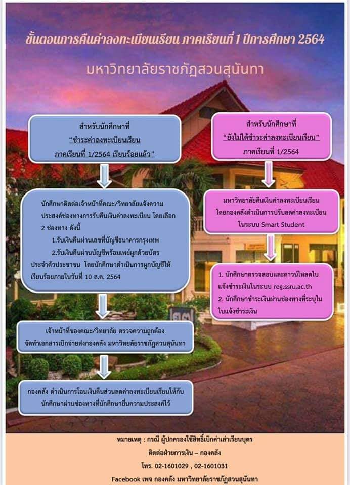 > ขั้นตอนการคืนค่าลงทะเบียนเรียน ภาคเรียนที่ 1 ปีการศึกษา 2564 มหาวิทยาลัยราชภัฏสวนสุนันทา