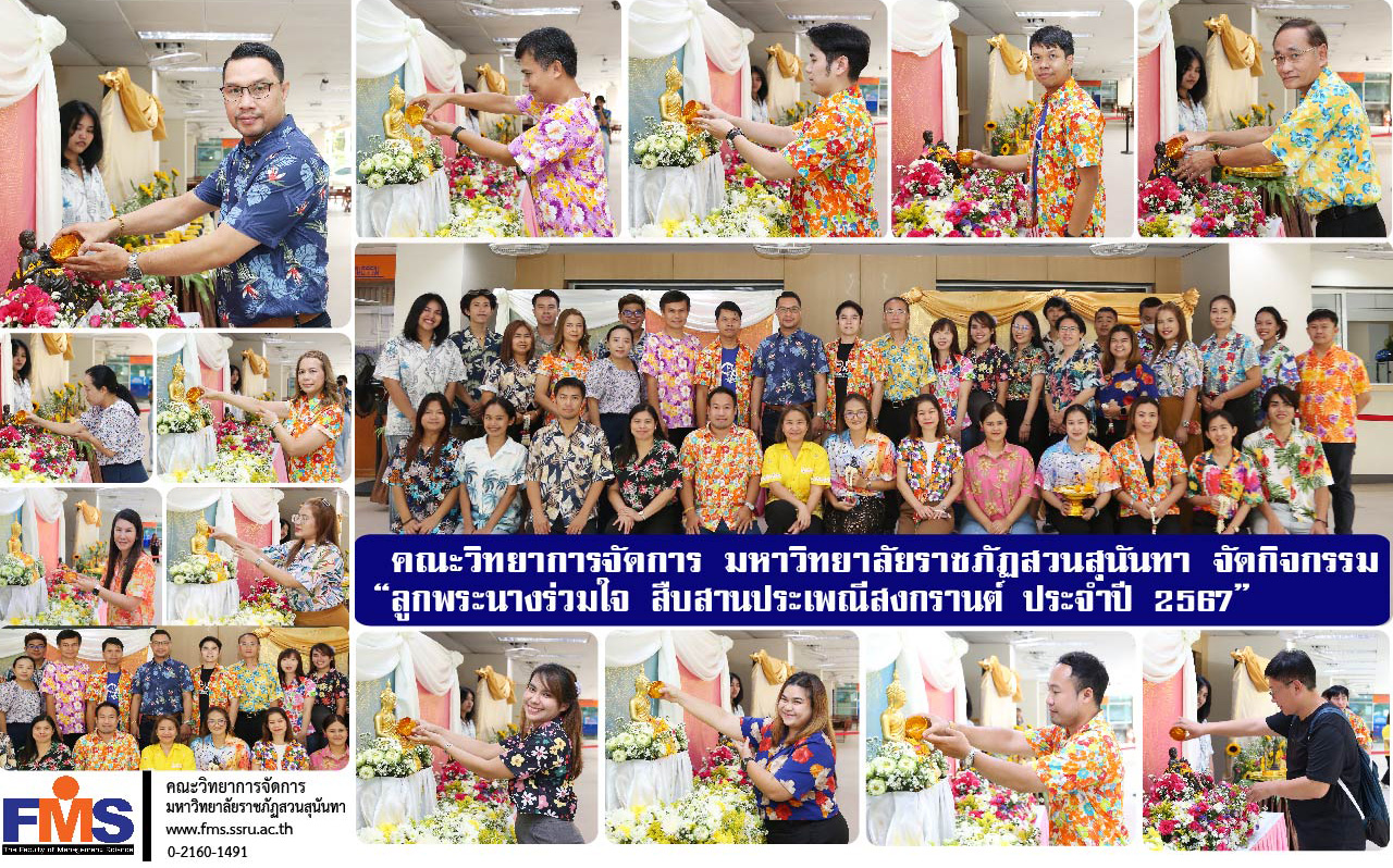 วันที่ 10 เมษายน 2567 ฝ่ายกิจการนักศึกษาและศิลปวัฒนธรรม คณะวิทยาการจัดการ มหาวิทยาลัยราชภัฏสวนสุนันทา จัดงานสืบสานประเพณีสงกรานต์ ภายใต้ชื่อ “ลูกพระนางร่วมใจ สืบสานประเพณีสงกรานต์ 2567” โดยผู้ช่วยศาสตราจารย์ ดร.สมศักดิ์ คล้ายสังข์ คณบดีคณะวิทยาการจัดการ เป็นประธานในพิธี มีผู้บริหาร อาจารย์ บุคลากรสายสนับสนุนวิชาการ แขกผู้มีเกียรติ และนักศึกษา เข้าร่วมกิจกรรม ณ ลานอเนกประสงค์อาคาร 56 คณะวิทยาการจัดการ มหาวิทยาลัยราชภัฏสวนสุนันทา