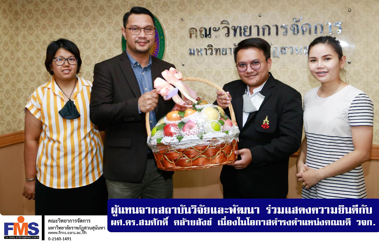 วันที่ 3 พฤศจิกายน 2563 เวลา 14.45 น. ผู้แทนจากสถาบันวิจัยและพัฒนา มหาวิทยาลัยราชภัฏสวนสุนันทา มอบกระเช้าผลไม้แสดงความยินดีแก่ ผู้ช่วยศาสตราจารย์ ดร.สมศักดิ์ คล้ายสังข์ ในโอกาสได้รับแต่งตั้งให้ดำรงตำแหน่งคณบดีคณะวิทยาการจัดการ ณ ห้องรวมใจการจัดการ 1 คณะวิทยาการจัดการ