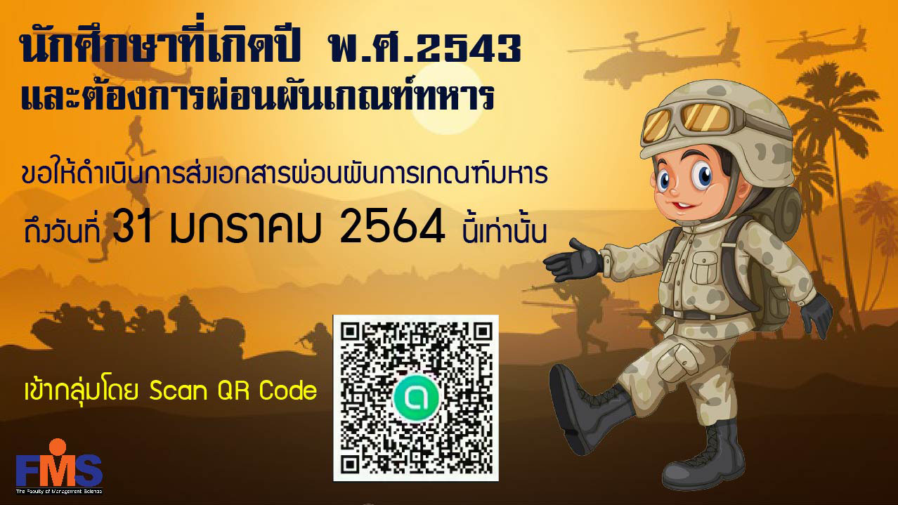 สำหรับน้องๆนักศึกษาที่เกิดปี พ.ศ. 2543 และต้องการผ่อนผันการเกณฑ์ทหาร ขอให้ดำเนินการส่งเอกสารการผ่อนผันฯ ได้จนถึงวันที่ 31 มกราคม 2564 นี้ โดยเข้ากลุ่มด้วยวิธีการ Scan QR Code รีบดำเนินการก่อนหมดเขตน๊าาา