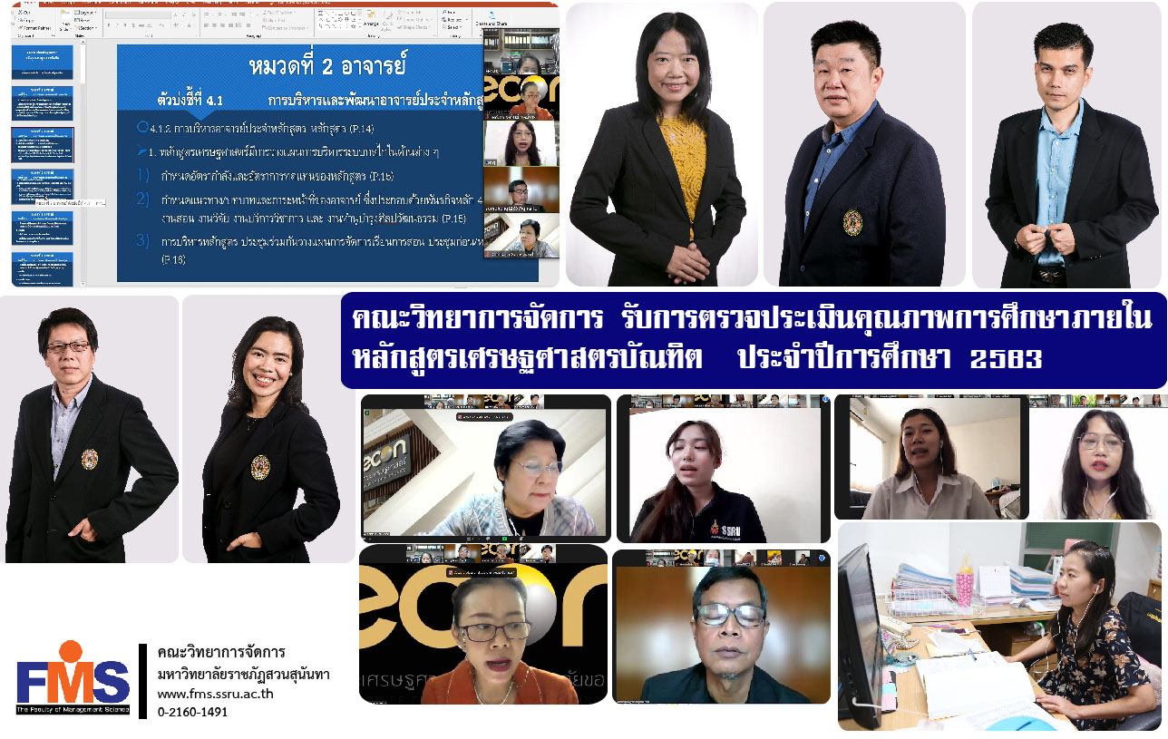 วันที่ 8 กรกฎาคม 2564 ฝ่ายแผนงานและประกันคุณภาพ คณะวิทยาการจัดการ จัด "โครงการตรวจประเมินคุณภาพการศึกษาภายใน ระดับหลักสูตร ประจำปีการศึกษา 2563" หลักสูตรเศรษฐศาสตรบัณฑิต ได้รับเกียรติจากคณะกรรมการผู้ทรงคุณวุฒิ ที่ผ่านการอบรมผู้ตรวจประเมินจากสำนักงานคณะกรรมการการอุดมศึกษา (สกอ.) และเป็นผู้ที่มีความรู้ความเชี่ยวชาญด้านเกณฑ์การประกันคุณภาพ ระดับหลักสูตรเป็นอย่างดี ได้แก่ ผู้ช่วยศาสตราจารย์ ดร.จงรักษ์ หงษ์งาม (ประธาน) ผู้ช่วยศาสตราจารย์สมพงษ์ มหิงสพันธุ์ ผู้ช่วยศาสตราจารย์จินตนา สมสวัสดิ์ และนางสาวพัชรี ทรัพย์ประเสิริฐ เลขานุการตรวจประเมินฯ ซึ่งมีคณาจารย์ประจำหลักสูตร ผู้ใช้บัณฑิต ศิษย์เก่า และศิษย์ปัจจุบัน ให้ความร่วมมือในการดำเนินงานเป็นอย่างดี ในรูปแบบการประชุมทางระบบออนไลน์ด้วยโปรแกรม Google Meet