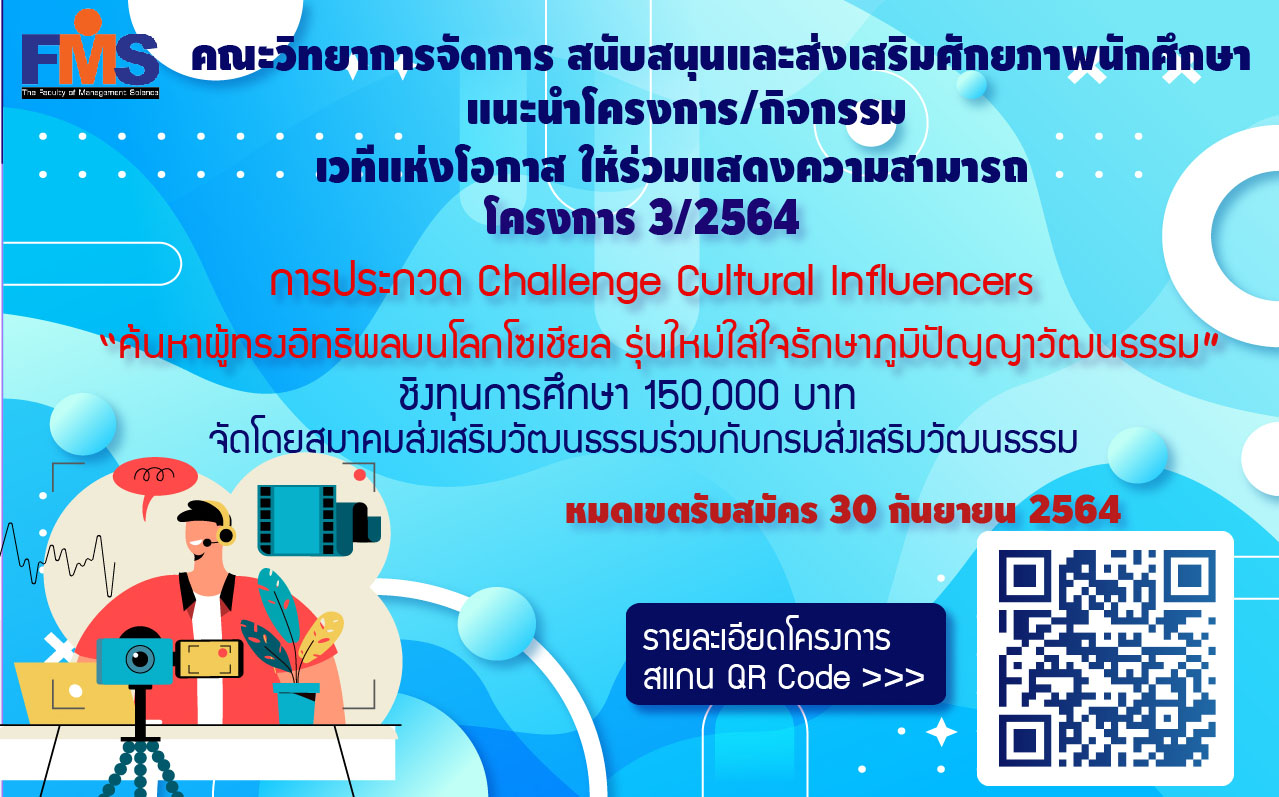 ประชาสัมพันธ์โครงการ/กิจกรรม สำหรับน้องๆนักศึกษาคณะวิทยาการจัดการทุกสาขาวิชา/ทุกแขนงวิชา ทุกชั้นปี ร่วมส่งผลงานเข้าร่วมการประกวด Challenge Cultural Influencers “ค้นหาผู้ทรงอิทธิพลบนโลกโซเชียล รุ่นใหม่ใส่ใจรักษาภูมิปัญญาวัฒนธรรม” ชิงทุนการศึกษากว่า 150,000 บาท เริ่มลงทะเบียนรับสมัครได้ตั้งแต่ บัดนี้ ถึง 30 กันยายน 2564 ผ่านช่องทาง Line Official: @treasuremall (https://lin.ee/nqy7NKP)