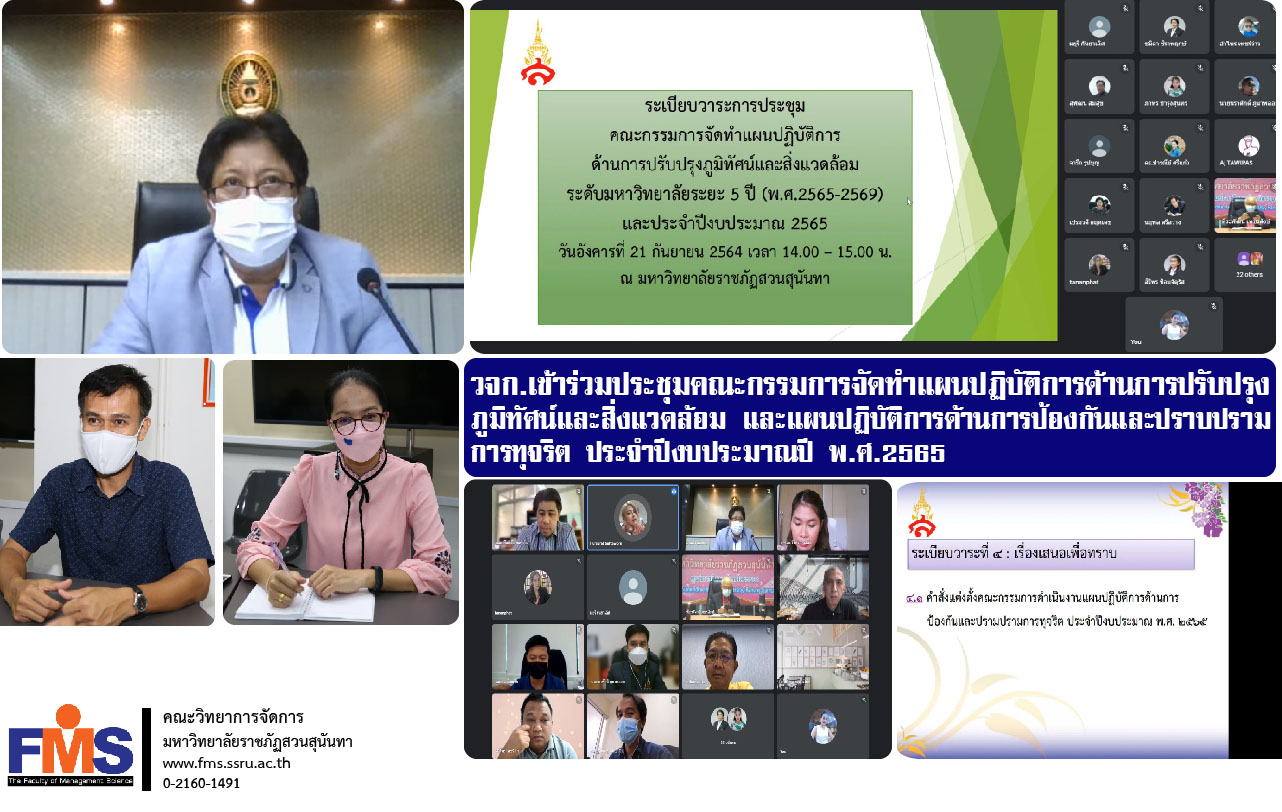 วันที่ 21 กันยายน 2564 อาจารย์ปิติมนัส บรรลือ รองคณบดีฝ่ายบริหาร และนางสาวภคพร เดชอนันต์ รักษาการหัวหน้าฝ่ายบริหารงานทั่วไป คณะวิทยาการจัดการ เข้าร่วมประชุมคณะกรรมการจัดทำแผนปฏิบัติการด้านการปรับปรุงภูมิทัศน์และสิ่งแวดล้อมระดับมหาวิทยาลัย ระยะ 5 ปี (พ.ศ.2565-2569) และประจำปีงบประมาณ พ.ศ.2565 และแผนปฏิบัติการด้านการป้องกันและปราบปรามการทุจริต ประจำปีงบประมาณปี พ.ศ.2565 ซึ่งได้รับเกียรติจาก ผู้ช่วยศาสตราจารย์ ดร.ปรีชา พงษ์เพ็ง รองอธิการบดีฝ่ายบริหาร มหาวิทยาลัยราชภัฏสวนสุนันทา เป็นประธานการประชุม มีผู้บริหาร หัวหน้าฝ่าย ประจำหน่วยงาน วิทยาลัย คณะ เข้าร่วมประชุม ผ่านระบบออนไลน์ Google Meet