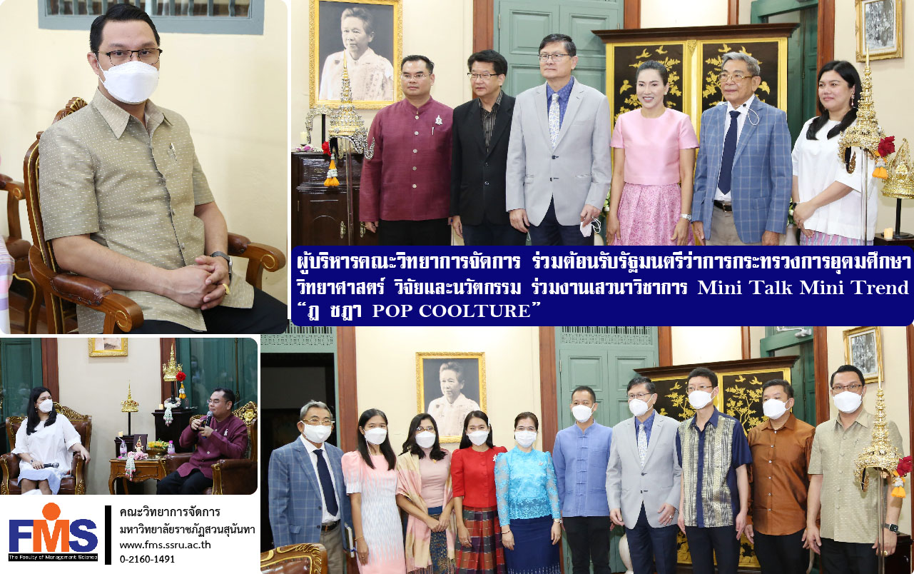 วันที่ 2 ตุลาคม 2564 เวลา 09.30 น. ผู้ช่วยศาสตราจารย์ ดร. สมศักดิ์ คล้ายสังข์ คณบดีคณะวิทยาการจัดการ มหาวิทยาลัยราชภัฏสวนสุนันทา เข้าร่วมการเสวนาวิชาการ Mini Talk Mini Trend “ฎ ชฎา POP COOLTURE” จัดโดยวิทยสถานด้านมนุษยศาสตร์และศิลปกรรมศาสตร์แห่งประเทศไทย กระทรวงการอุดมศึกษา วิทยาศาสตร์ วิจัยและนวัตกรรม ร่วมกับมหาวิทยาลัยราชภัฏสวนสุนันทา และในโอกาสนี้รองศาสตราจารย์ ดร.ชุติกาญจน์ ศรีวิบูลย์ อธิการบดีมหาวิทยาลัยราชภัฏสวนสุนันทา พร้อมด้วยคณะผู้บริหารมหาวิทยาลัย และคณบดีคณะวิทยาการจัดการ ร่วมให้การต้อนรับศาสตราจารย์พิเศษ ดร.เอนก เหล่าธรรมทัศน์ รัฐมนตรีว่าการกระทรวงการอุดมศึกษา วิทยาศาสตร์ วิจัยและนวัตกรรม และร่วมรับฟังเสวนา ณ อาคารสายสุทธานภดล มหาวิทยาลัยราชภัฏสวนสุนันทา
