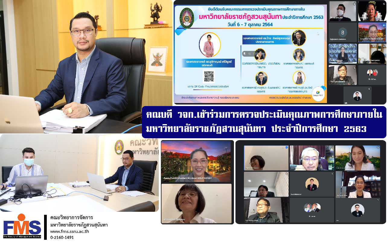 วันที่ 6 ตุลาคม 2564 ผู้ช่วยศาสตราจารย์ ดร.สมศักดิ์ คล้ายสังข์ คณบดีคณะวิทยาการจัดการ เข้าร่วมการตรวจประเมินคุณภาพการศึกษาภายใน มหาวิทยาลัยราชภัฏสวนสุนันทา ประจำปีการศึกษา 2563 จัดโดยกองนโยบายและแผน สำนักงานอธิการบดี โดยมีรองศาสตราจารย์ ดร.ชุติกาญจน์ ศรีวิบูลย์ อธิการบดีมหาวิทยาลัยราชภัฏสวนสุนันทา เป็นประธานกล่าวต้อนรับคณะกรรมการผู้ทรงคุณวุฒิและรับการตรวจประเมินคุณภาพการศึกษา ทั้งนี้ ได้รับเกียรติจาก รองศาสตราจารย์ ดร.ไทย ทิพย์สุวรรณกุล ประธานกรรมการ ร่วมด้วย รองศาสตราจารย์กมลพรรณ นามวงศ์พรหม รองศาสตราจารย์จันทนี เพชรานนท์ รองศาสตราจารย์ ดร.ยุทธนา ฉัพพรรณรัตน์ เป็นกรรมการผู้ทรงคุณวุฒิในการตรวจประเมินฯ และ รองศาสตราจารย์ ดร.ฤดี นิยมรัตน์ อาจารย์คณะเทคโนโลยีอุตสาหกรรม มหาวิทยาลัยราชภัฏสวนสุนันทา เป็นกรรมการและเลขานุการ โดยในวันแรกของการตรวจประเมินฯ คณบดีคณะวิทยาการจัดการ พร้อมด้วยอาจารย์ ผู้ใช้บัณฑิต และศิษย์เก่า ได้ให้สัมภาษณ์ต่อคณะกรรมการผู้ตรวจประเมิน ในรูปแบบการประชุมผ่านระบบออนไลน์ Google Meet สำหรับการสรุปผลการตรวจประเมินคุณภาพการศึกษาภายใน จะมีขึ้นในวันที่ 7 ตุลาคม 2564 นี้