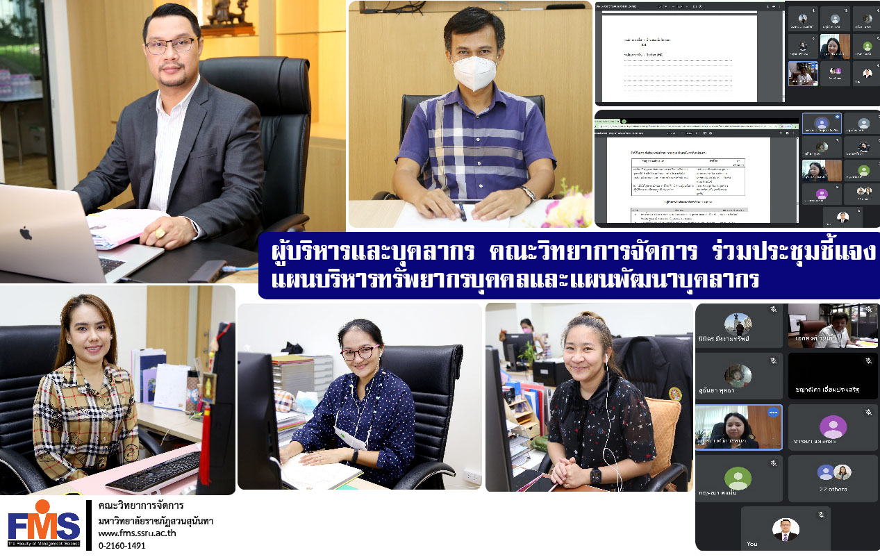 วันที่ 26 ตุลาคม 2564 เวลา 10.00 น. ผู้ช่วยศาสตราจารย์ ดร. สมศักดิ์ คล้ายสังข์ คณบดีคณะวิทยาการจัดการ พร้อมด้วยอาจารย์ปิติมนัส บรรลือ รองคณบดีฝ่ายบริหาร นางสาวจิณห์จุฑา ศรีเหรา หัวหน้าสำนักงานคณบดี นางสาวภคพร เดชอนันต์ รักษาการหัวหน้าฝ่ายบริหารงานทั่วไป และนางสาวสุพัสวี โมรากุล เจ้าหน้าที่งานบุคลากร เข้าร่วมประชุมชี้แจงแผนบริหารทรัพยากรบุคคลและแผนพัฒนาบุคลากร ผ่านระบบออนไลน์ด้วยโปรแกรม Google Meet