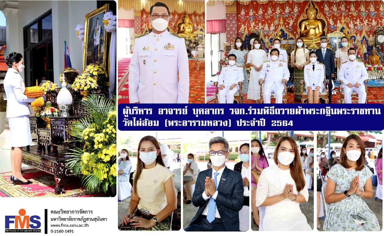 วันที่ 5 พฤศจิกายน 2564 ผู้ช่วยศาสตราจารย์ ดร.สมศักดิ์ คล้ายสังข์ คณบดีคณะวิทยาการจัดการ พร้อมด้วยอาจารย์ หัวหน้าสำนักงานคณบดี และบุคลากรสายสนับสนุนวิชาการ เดินทางไปเข้าร่วมพิธีถวายผ้าพระกฐินพระราชทาน ซึ่งจัดโดยสำนักศิลปะและวัฒนธรรม โดยมีรองศาสตราจารย์ ดร.ชุติกาญจน์ ศรีวิบูลย์ อธิการบดีมหาวิทยาลัยราชภัฏสวนสุนันทา เป็นประธานในพิธีถวายผ้าพระกฐินพระราชทาน พร้อมด้วย ผู้บริหาร อาจารย์และบุคลากรของมหาวิทยาลัย รวมทั้งประชาชนในจังหวัดจันทบุรี เข้าร่วมพิธีถวายผ้าพระกฐินพระราชทาน พร้อมทั้งเครื่องอัฐบริขารและเงินถวายเป็นพระราชกุศล ณ วัดไผ่ล้อม (พระอารามหลวง) ตำบลจันทนิมิต อำเภอเมืองจันทบุรี จังหวัดจันทบุรี