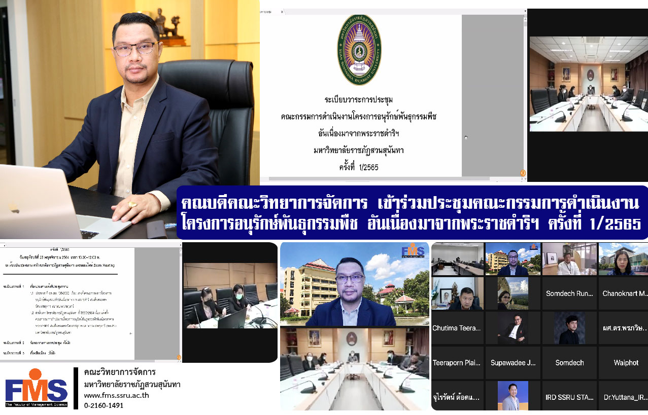 วันที่ 23 พฤศจิกายน 2564 เวลา 10.00 น. ผู้ช่วยศาสตราจารย์ ดร.สมศักดิ์ คล้ายสังข์ คณบดีคณะวิทยาการจัดการ เข้าร่วมประชุมคณะกรรมการดำเนินงาน โครงการอนุรักษ์พันธุกรรมพืช อันเนื่องมาจากพระราชดำริฯ มหาวิทยาลัยราชภัฏสวนสุนันทา ครั้งที่ 1/ 2565 โดยรองศาสตราจารย์ ดร. ชุติกาญจน์ ศรีวิบูลย์ อธิการบดีมหาวิทยาลัยราชภัฏสวนสุนันทา เป็นประธานการประชุม ในรูปแบบการประชุมออนไลน์ผ่านโปรแกรม Google Meet