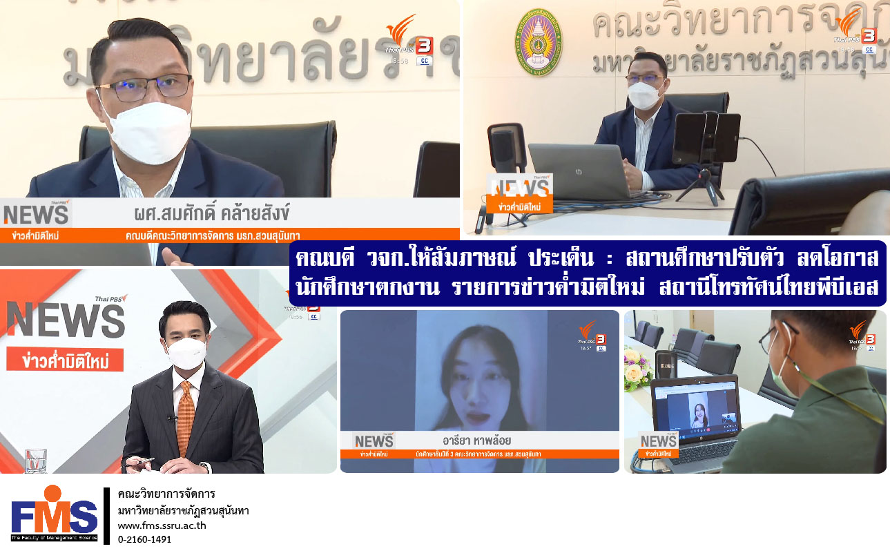 ผู้ช่วยศาสตราจารย์ ดร.สมศักดิ์ คล้ายสังข์ คณบดีคณะวิทยาการจัดการ มหาวิทยาลัยราชภัฏสวนสุนันทา ให้สัมภาษณ์รายการข่าวค่ำมิติใหม่ ทางสถานีโทรทัศน์ไทยพีบีเอส ในประเด็น : สถานศึกษาปรับตัว ลดโอกาสนักศึกษาตกงาน ออกอากาศเมื่อช่วงค่ำวันที่ 24 พฤศจิกายน 2564 ที่ผ่านมา