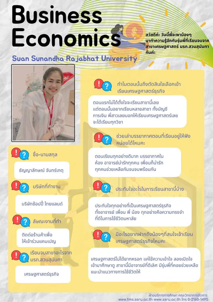 สาขาวิชาเศรษฐศาสตร์ธุรกิจ คณะวิทยาการจัดการ มหาวิทยาลัยราชภัฏสวนสุนันทา #ทางเลือกที่มีคุณภาพของคนรุ่นใหม่#เรียนรู้รอบด้านทั้งธุรกิจ_เศรษฐกิจ_เพื่อให้ก้าวทันโลกยุคเศรษฐกิจและสังคมแบบดิจิทัล