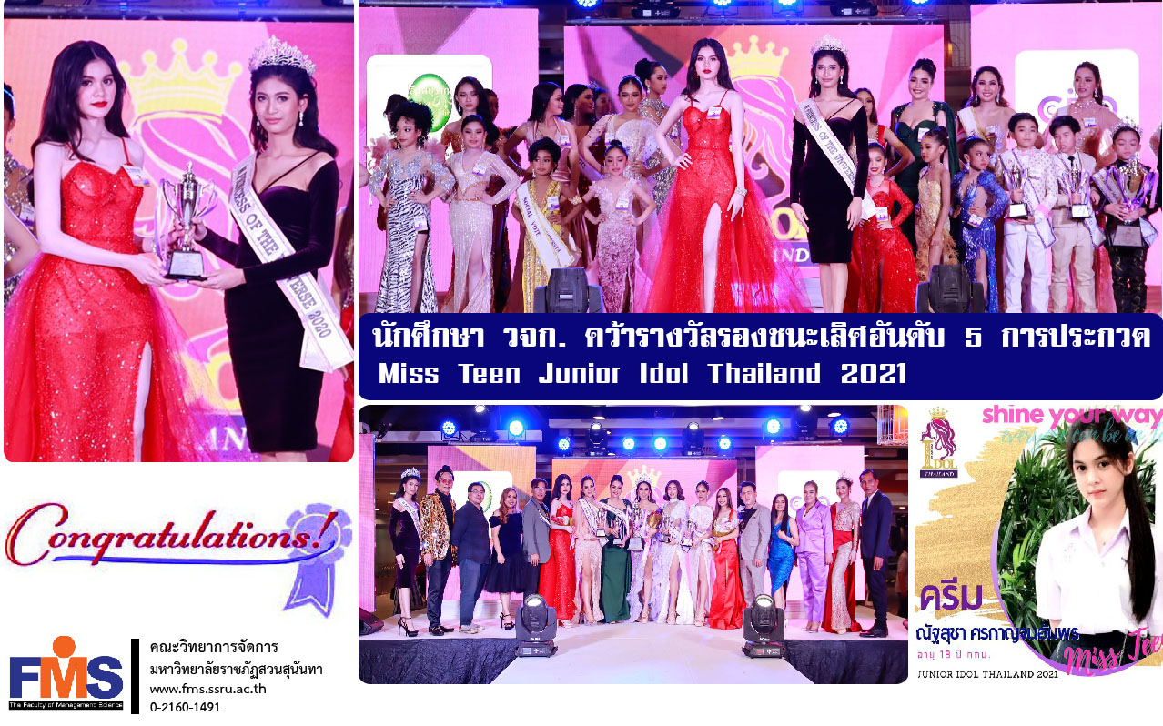 นางสาวณัฐสุชา ศรกาญจนอัมพร (ครีม) นักศึกษาแขนงวิชาการเงินการธนาคาร กลุ่มสาขาวิชาบริหารธุรกิจ คณะวิทยาการจัดการ มหาวิทยาลัยราชภัฏสวนสุนันทา ได้รับรางวัลรองชนะเลิศอันดับ 5 รุ่น Miss Teen 16-19 ปี ในการประกวด Miss Teen Junior Idol Thailand 2021 จัดโดยจัดโดย เรือนนาฏอนงค์ Fairy Kids Contest และ WOW Pageantry Thailand