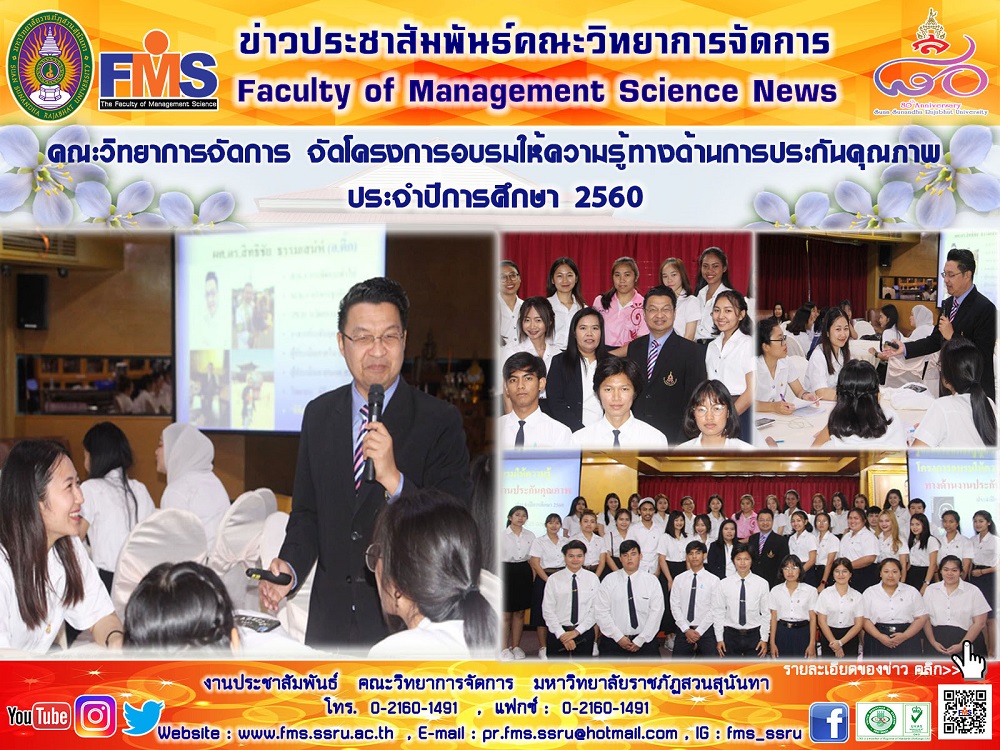 วันที่ 25 เมษายน 2561 ฝ่ายกิจการนักศึกษาและศิลปวัฒนธรรม คณะวิทยาการจัดการ จัดโครงการอบรมให้ความรู้ทางด้านการประกันคุณภาพ ประจำปีการศึกษา 2560 โดยอาจารย์สุพัตรา กาญจโนภาส รองคณบดีฝ่ายกิจการนักศึกษา เป็นประธานเปิดโครงการ