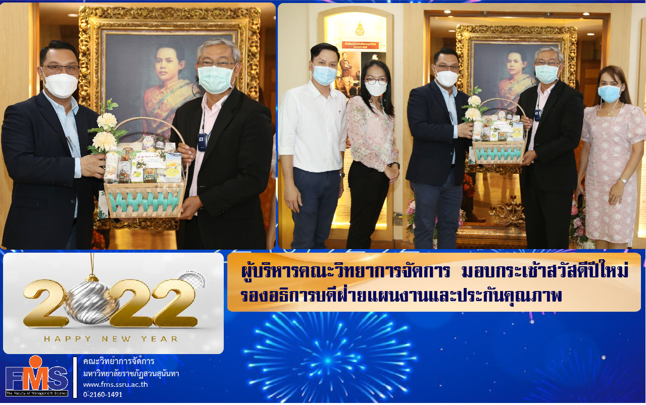 วันที่ 4 มกราคม 2565 คณะวิทยาการจัดการ นำโดย ผู้ช่วยศาสตราจารย์ ดร.สมศักดิ์ คล้ายสังข์ คณบดี พร้อมด้วยหัวหน้าสำนักงานคณบดี หัวหน้าฝ่ายบริหารงานทั่วไป และบุคลากรสายสนับสนุนวิชาการประจำคณะ ได้เข้าพบและมอบกระเช้าของขวัญปีใหม่แด่ รองศาสตราจารย์ ดร.วิทยา เมฆขำ รองอธิการบดีฝ่ายแผนงานและประกันคุณภาพ เนื่องในโอกาสวันขึ้นปีใหม่ 2565 ณ สำนักงานอธิการบดี ชั้น 5 มหาวิทยาลัยราชภัฏสวนสุนันทา