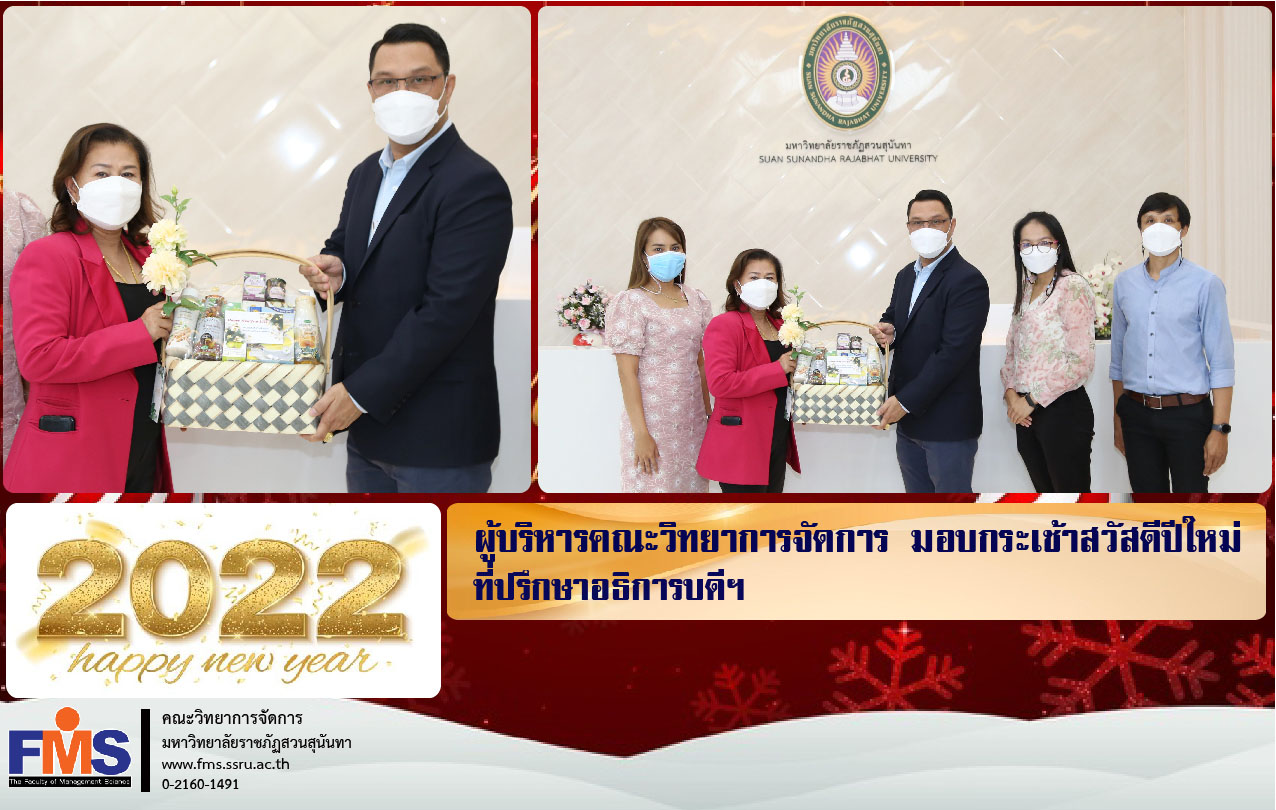 วันที่ 4 มกราคม 2565 คณะวิทยาการจัดการ นำโดย ผู้ช่วยศาสตราจารย์ ดร.สมศักดิ์ คล้ายสังข์ คณบดี พร้อมด้วยหัวหน้าสำนักงานคณบดี หัวหน้าฝ่ายบริหารงานทั่วไป และบุคลากรสายสนับสนุนวิชาการประจำคณะ ได้เข้าพบและมอบกระเช้าของขวัญปีใหม่แด่ นางจุณีรัตน์ จันทร์นิตย์ ที่ปรึกษาอธิการบดีฯ เนื่องในโอกาสวันขึ้นปีใหม่ 2565 ณ ห้องรับรองสำนักงานอธิการบดี อาคาร 31 ชั้น 1