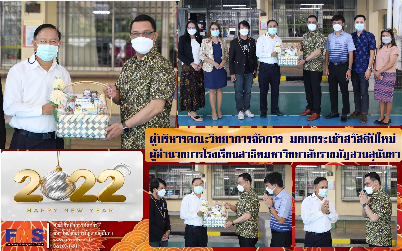 วันที่ 7 ธันวาคม 2565 คณะวิทยาการจัดการ นำโดย ผู้ช่วยศาสตราจารย์ ดร.สมศักดิ์ คล้ายสังข์ คณบดี และคณะผู้บริหาร รองคณบดี อาจารย์ หัวหน้าสำนักงานคณบดี บุคลากรสายสนับสนุนวิชาการ ได้เข้าพบและมอบกระเช้าของขวัญปีใหม่แด่ รองศาสตราจารย์ ดร.สมเกียรติ กอบัวแก้ว ผู้อำนวยการโรงเรียนสาธิตมหาวิทยาลัยราชภัฏสวนสุนันทา เนื่องในโอกาสวันขึ้นปีใหม่ 2565 ณ โรงเรียนสาธิตมหาวิทยาลัยราชภัฏสวนสุนันทา