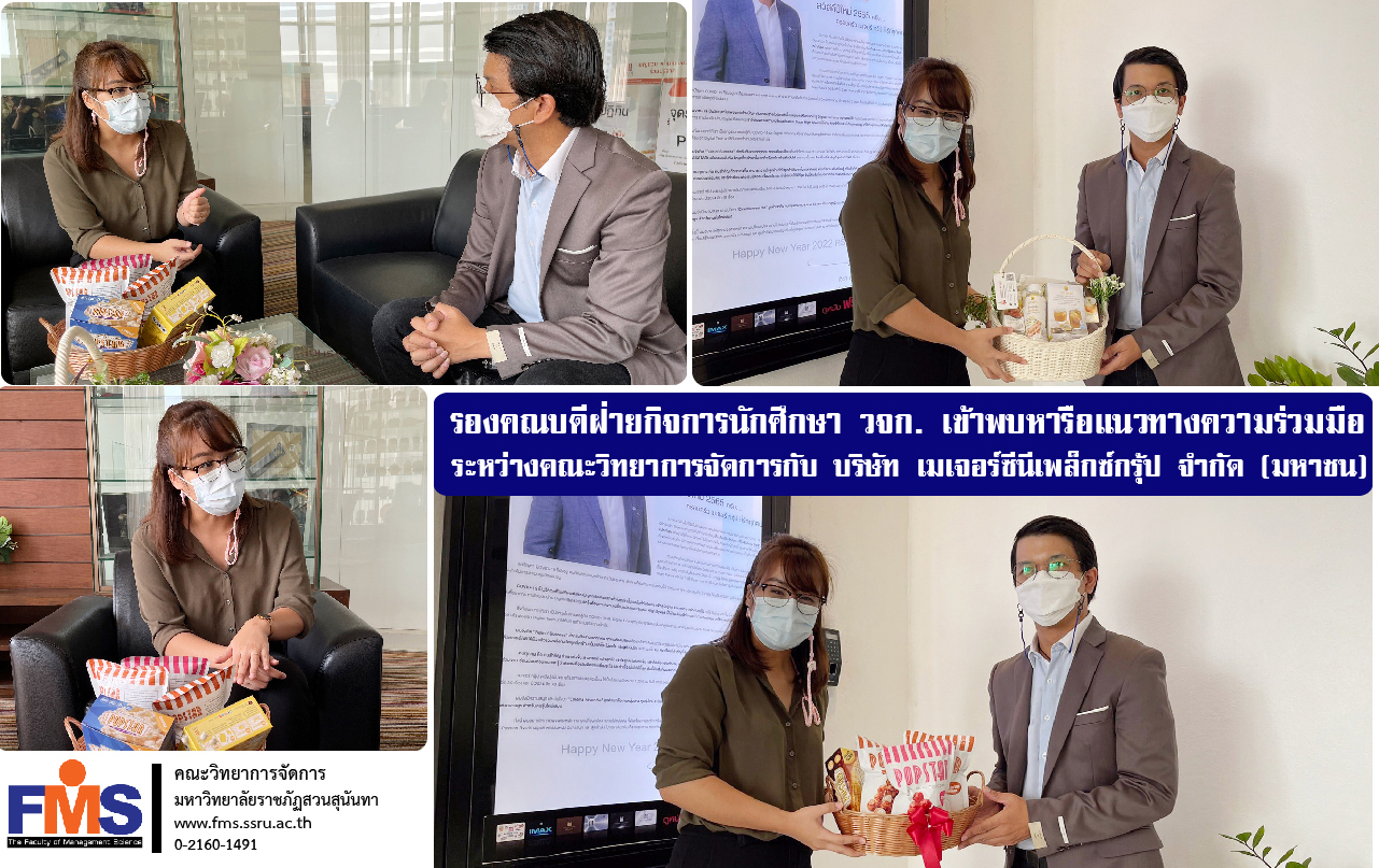 อาจารย์ ดร.พงศวีร์ สุภานนท์ รองคณบดีฝ่ายกิจการนักศึกษา คณะวิทยาการจัดการ มหาวิทยาลัยราชภัฏสวนสุนันทา ได้เข้าพบนางสาววันวิสาข์ พลสมัคร เจ้าหน้าที่อาวุโสฝ่ายบริหารทรัพยากรมนุษย์ บริษัท เมเจอร์ซีนีเพล็กซ์กรุ้ป จำกัด (มหาชน) เพื่อหารือเกี่ยวกับแนวทางความร่วมมือในด้านกิจกรรม ณ บริษัท เมเจอร์ซีนีเพล็กซ์กรุ้ป จำกัด (มหาชน) กรุงเทพมหานคร