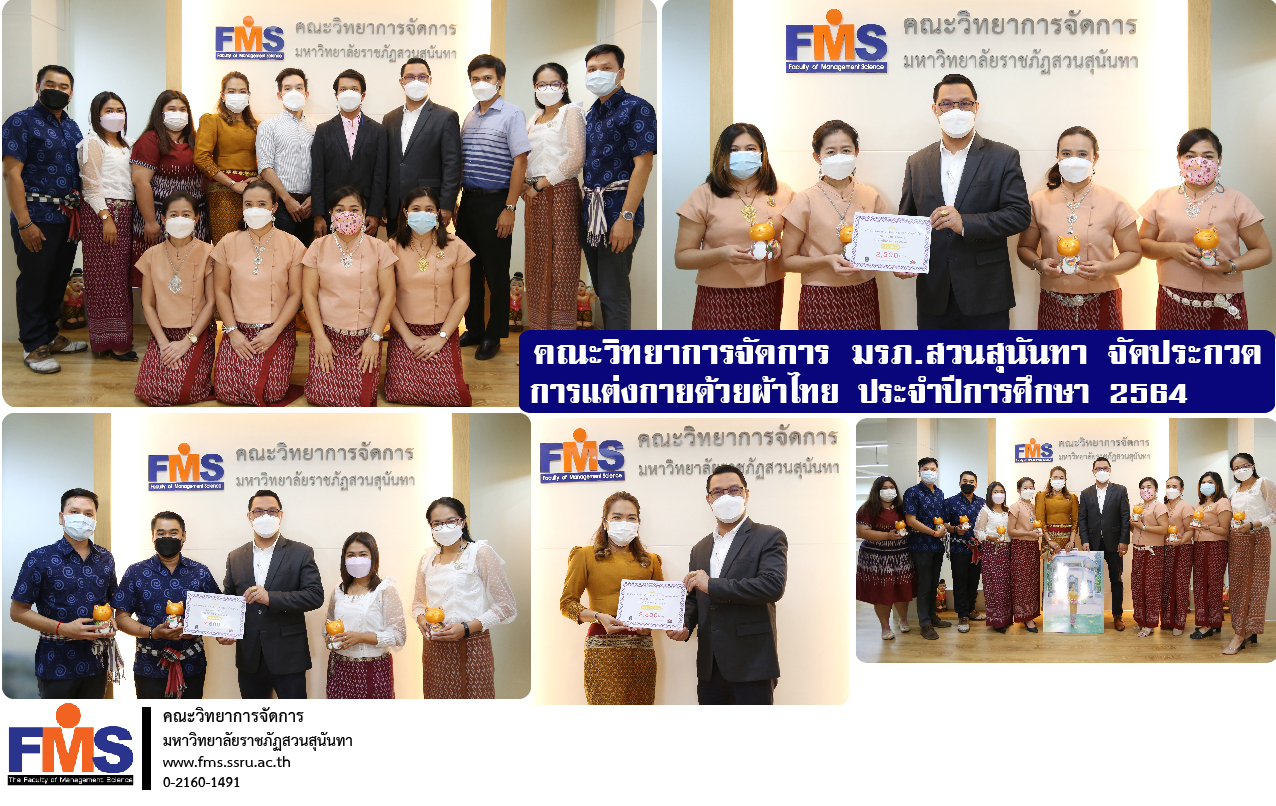 ฝ่ายกิจการนักศึกษาและศิลปวัฒนธรรม คณะวิทยาการจัดการ จัดโครงการประกวดการแต่งกายด้วยผ้าไทย คณะวิทยาการจัดการ ประจำปีการศึกษา 2564 มีอาจารย์และบุคลากรสายสนับสนุนวิชาการ คณะวิทยาการจัดการ เข้าร่วมประกวดแต่งกายด้วยผ้าไทย ซึ่งผลการตัดสินมีผู้ที่ได้รับรางวัลการประกวด ทั้งประเภทเดี่ยว และประเภททีม ในโอกาสนี้ได้รับเกียรติจากผู้ช่วยศาสตราจารย์ ดร.สมศักดิ์ คล้ายสังข์ คณบดีคณะวิทยาการจัดการ เป็นประธานมอบรางวัลแก่ผู้ชนะการประกวดทั้ง 2 ประเภท ณ สำนักงานคณบดีคณะวิทยาการจัดการ อาคาร 56 ชั้น 1
