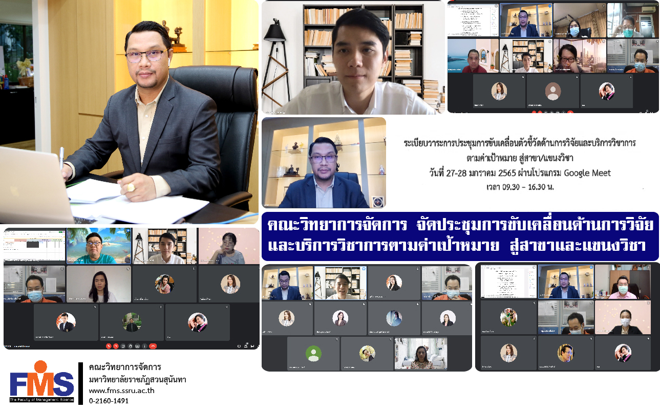 วันที่ 27 มกราคม 2565 คณะวิทยาการจัดการ มหาวิทยาลัยราชภัฏสวนสุนันทา จัดประชุมการขับเคลื่อนด้านการวิจัยและบริการวิชาการตามค่าเป้าหมาย สู่สาขาและแขนงวิชา โดยผู้ช่วยศาสตราจารย์ ดร.สมศักดิ์ คล้ายสังข์ คณบดีคณะวิทยาการจัดการ เป็นประธานการประชุม ร่วมด้วยผู้ช่วยศาสตราจารย์ ดร. ณัฐพงษ์ เตชะรัตนเสฏฐ์ รองคณบดีฝ่ายวิจัยและบริการวิชาการ โดยในวันนี้เป็นการประชุมสำหรับสาขาวิชาเศรษฐศาสตร์ธุรกิจ แขนงวิชาการตลาด แขนงวิชาการประกอบการธุรกิจ และแขนงวิชาการจัดการธุรกิจบริการ มีหัวหน้ากลุ่มสาขาวิชา/หัวหน้าแขนงวิชา อาจารย์ประจำสาขาวิชา/แขนงวิชา เข้าร่วมประชุม ในรูปแบบการประชุมออนไลน์ด้วยโปรแกรม Google Meet