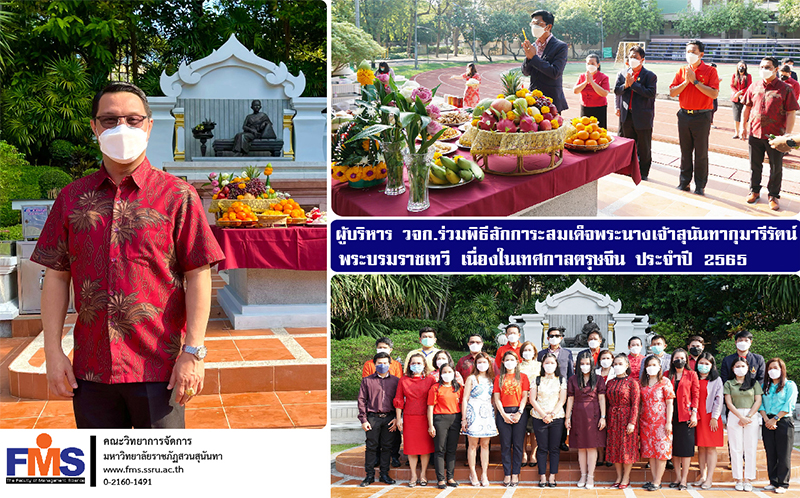 วันที่ 31 มกราคม 2565 ผู้ช่วยศาสตราจารย์ ดร.สมศักดิ์ คล้ายสังข์ คณบดีคณะวิทยาการจัดการ พร้อมด้วยอาจารย์ประจำคณะ ได้รับเกียรติร่วมพิธีสักการะสมเด็จพระนางเจ้าสุนันทากุมารีรัตน์ พระบรมราชเทวี เนื่องในเทศกาลตรุษจีน ประจำปี 2565 โดยมีรองศาสตราจารย์ ดร.ฤๅเดช เกิดวิชัย นายกสภามหาวิทยาลัยราชภัฏสวนสุนันทา เป็นประธานในพิธี ณ ลานหน้าพระราชานุสาวรีย์ สมเด็จพระนางเจ้าสุนันทากุมารีรัตน์ พระบรมราชเทวี มหาวิทยาลัยราชภัฏสวนสุนันทา