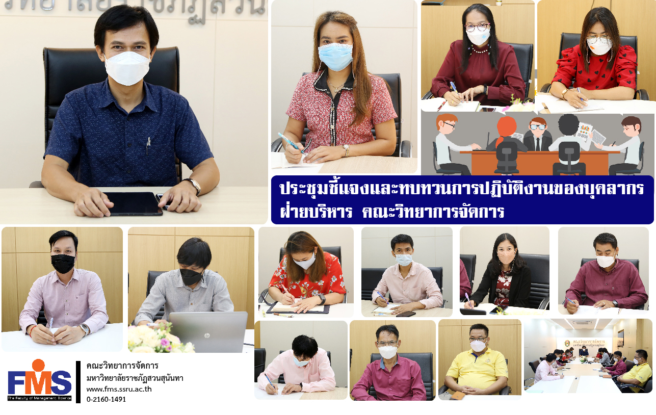 วันที่ 1 กุมภาพันธ์ 2565 คณะวิทยาการจัดการ มหาวิทยาลัยราชภัฏสวนสุนันทา จัดประชุมชี้แจงและทบทวนการปฏิบัติงานของบุคลากรฝ่ายบริหาร โดยมีอาจารย์ปิติมนัส บรรลือ รองคณบดีฝ่ายบริหาร คณะวิทยาการจัดการ เป็นประธานการประชุม ในวาระเกี่ยวกับการเตรียมความพร้อมจัดการเรียนการสอนแบบ Onsite การอำนวยความสะดวกแก่คณาจารย์และนักศึกษา และวาระอื่นๆที่เกี่ยวข้อง โดยมีหัวหน้าสำนักงานคณบดี หัวหน้าฝ่ายบริหารงานทั่วไป หัวหน้าฝ่ายคลังและพัสดุ และบุคลากรสายสนับสนุนวิชาการฝ่ายบริหารงานทั่วไปและฝ่ายพัสดุ เข้าร่วมประชุม ณ ห้องประชุมรวมใจการจัดการ 1 คณะวิทยาการจัดการ