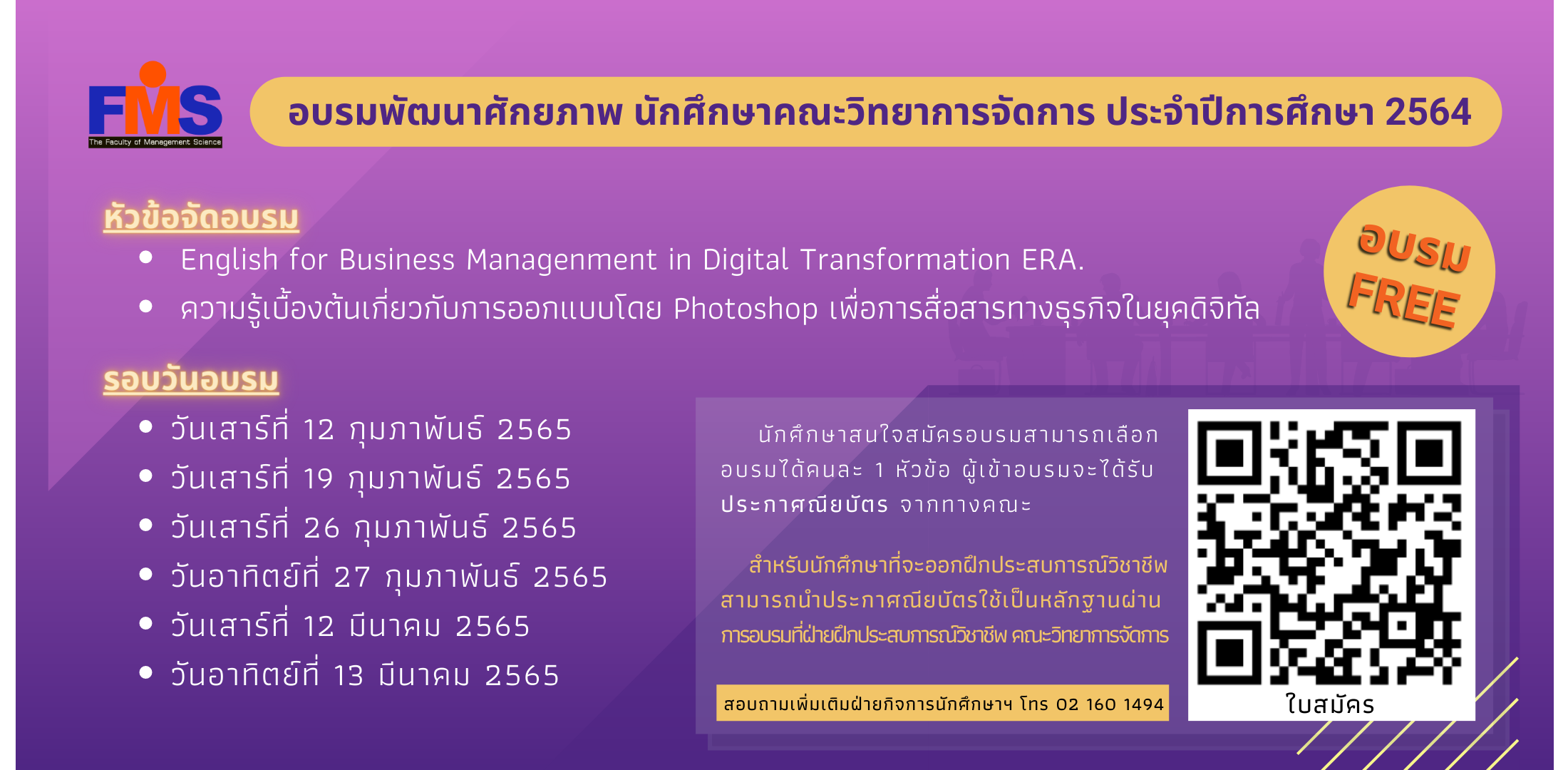 รอบการอบรม 6 รอบ 12, 19, 26-27 ก.พ. 65 และ 12-13 มี.ค. 65 เวลา 09.00 - 12.00 น. รับรอบละ 50 ท่าน นะ