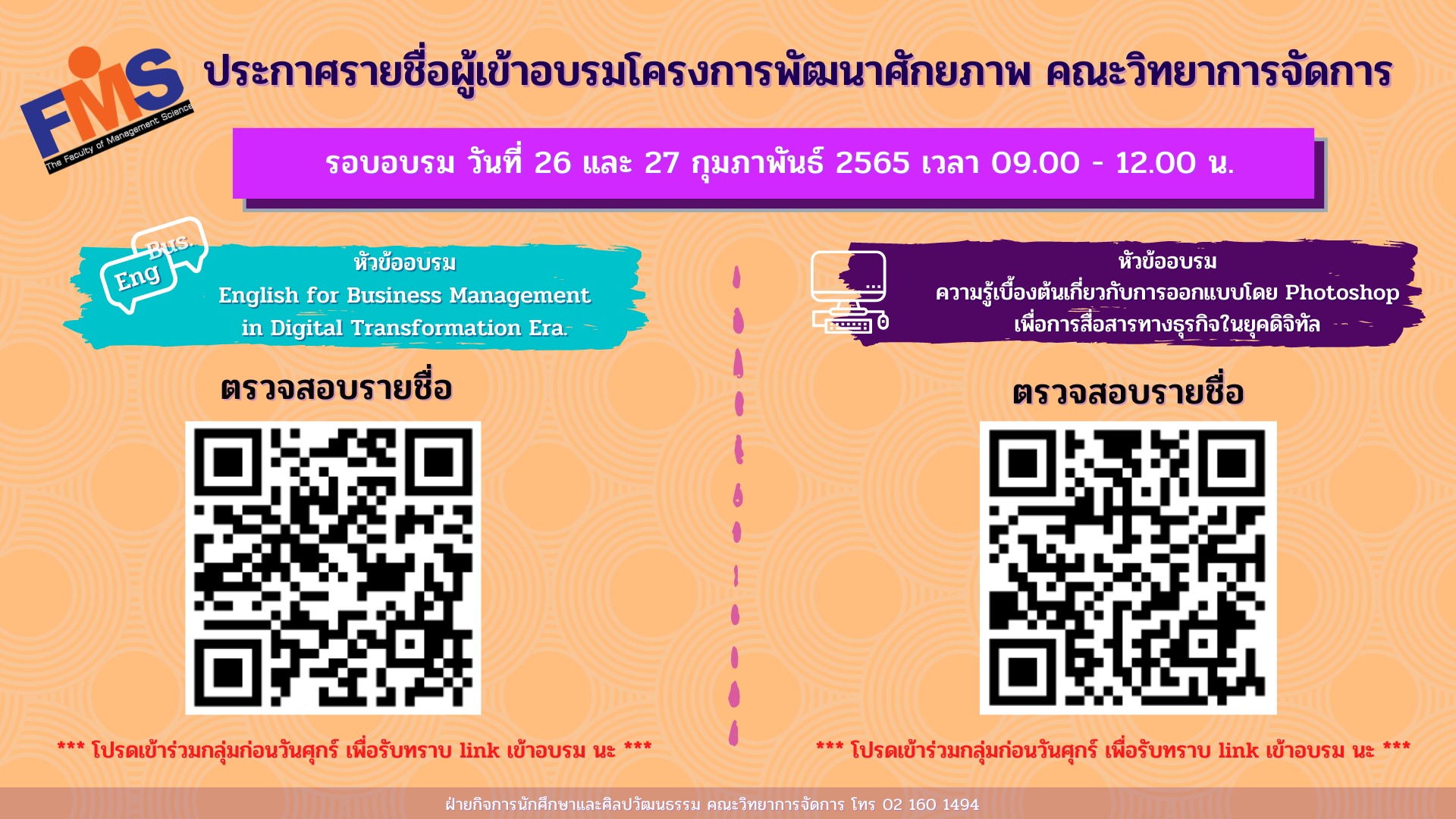 หมายเหตุ นักศึกษาทุกคนที่ลงอบรมมีรายชื่อตามประกาศให้ Add ไลน์กลุ่มตามหัวข้ออบรมของตนเองโดยจะมีการแจ้ง link เข้าอบรมในวันศุกร์อีกครั้ง และเป็นช่องทางติดต่อระหว่างการอบรมที่มา: ฝ่ายกิจการนักศึกษาและศิลปวัฒนธรรม คณะวิทยาการจัดการ