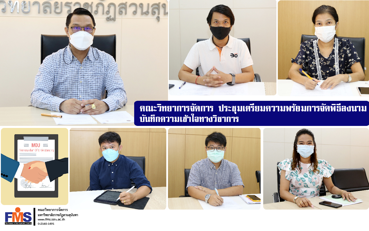วันที่ 1 มีนาคม 2565 ผู้ช่วยศาสตราจารย์ ดร. สมศักดิ์ คล้ายสังข์ คณบดีคณะวิทยาการจัดการ เป็นประธานในการประชุมเตรียมความพร้อมในการจัดพิธีลงนามบันทึกความเข้าใจทางวิชาการ โดยมีอาจารย์ ดร.พงศวีร์ สุภานนท์ รองคณบดีฝ่ายกิจการนักศึกษา พร้อมด้วยหัวหน้าฝ่าย บุคลากรฝ่ายกิจการนักศึกษาและศิลปวัฒนธรรม และนักประชาสัมพันธ์ประจำคณะ เข้าร่วมประชุม เพื่อเตรียมความพร้อมในการจัดพิธีลงนามบันทึกความเข้าใจทางวิชาการ ที่จะจัดขึ้นในวันพุธที่ 9 มีนาคม 2565 โดยได้มอบหมายภารกิจและหน้าที่ให้แต่ละฝ่ายรับผิดชอบ และได้มีการร่วมหารือร่วมกันเพื่อหาข้อสรุป เตรียมดำเนินการตามแผนให้บรรลุตามวัตถุประสงค์ ณ ห้องประชุมรวมใจการจัดการ คณะวิทยาการจัดการ