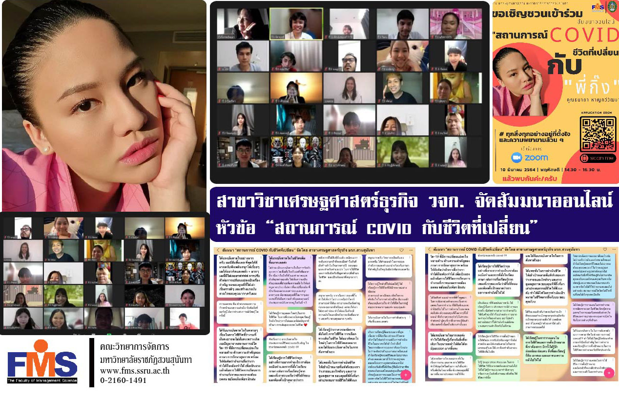 เมื่อเร็วๆนี้ นักศึกษาสาขาวิชาเศรษฐศาสตร์ธุรกิจ ชั้นปีที่ 3 ภาคปกติ คณะวิทยาการจัดการ มหาวิทยาลัยราชภัฏสวนสุนันทา จัดโครงการสัมมนาออนไลน์ หัวข้อ “สถานการณ์ COVID กับชีวิตที่เปลี่ยน” โดยได้รับเกียรติจาก คุณธนาดา หาญทวีวัฒนา (พี่กิ๊ง) แอร์โฮสเตสสาวสวย มากความสามารถ เป็นวิทยากรให้ความรู้ กำลังใจ และแรงบันดาลใจ แก่นักศึกษาและอาจารย์ประจำสาขา ในรูปแบบการสัมมนาออนไลน์ผ่านแอพพลิเคชัน Zoom