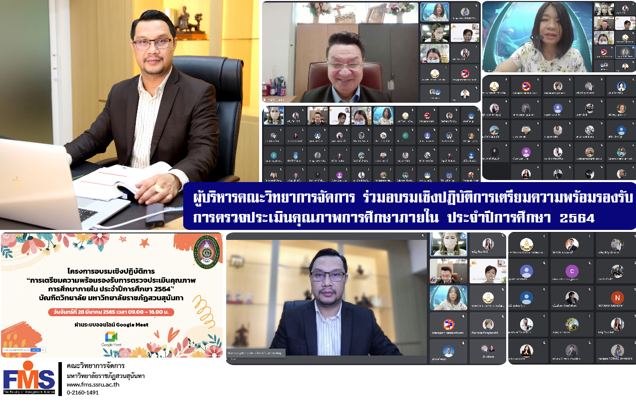 วันที่ 28 มีนาคม 2565 ผู้ช่วยศาสตราจารย์ ดร.สมศักดิ์ คล้ายสังข์ คณบดีคณะวิทยาการจัดการ เข้าร่วมโครงการอบรมเชิงปฏิบัติการ การเตรียมความพร้อมรองรับการตรวจประเมินคุณภาพการศึกษาภายใน ประจำปีการศึกษา 2564 โดยมีผู้ช่วยศาสตราจารย์ ดร.สิทธิชัย ธรรมเสน่ห์ ผู้ช่วยอธิการบดีฝ่ายวิชาการ เป็นวิทยากรบรรยายในการอบรมครั้งนี้ จัดโดยบัณฑิตวิทยาลัย มหาวิทยาลัยราชภัฏสวนสุนันทา ผ่านระบบออนไลน์ Google Meet