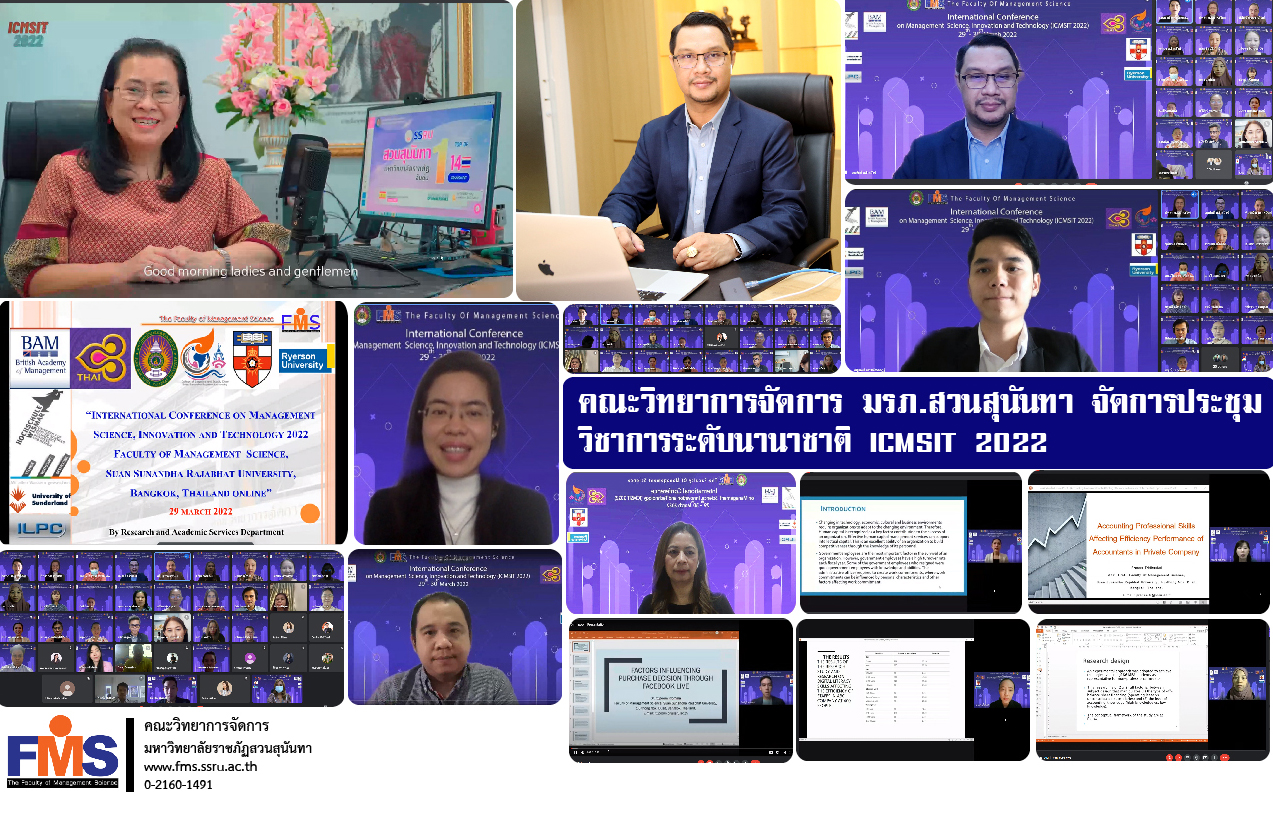 วันที่ 29 มีนาคม 2565 คณะวิทยาการจัดการ มหาวิทยาลัยราชภัฏสวนสุนันทา จัดการประชุมวิชาการระดับชาติและนานาชาติ ICMSIT 2022 International Conference on Management Science, Innovation and Technology 2022 Faculty of Management Science, Suan Sunandha Rajabhat University, Bangkok,Thailand โดยได้รับเกียรติจาก ผู้ช่วยศาสตราจารย์ ดร. สุวรีย์ ยอดฉิม รองอธิการบดีฝ่ายวิจัยและพัฒนา มหาวิทยาลัยราชภัฏสวนสุนันทา เป็นประธานในพิธีเปิดการประชุม และผู้ช่วยศาสตราจารย์ ดร.สมศักดิ์ คล้ายสังข์ คณบดีคณะวิทยาการจัดการ กล่าวรายงาน ดำเนินรายการโดยผู้ช่วยศาสตราจารย์ ดร. ณัฐพงษ์ เตชะรัตนเสฏฐ์ รองคณบดีฝ่ายวิจัยและบริการวิชาการ