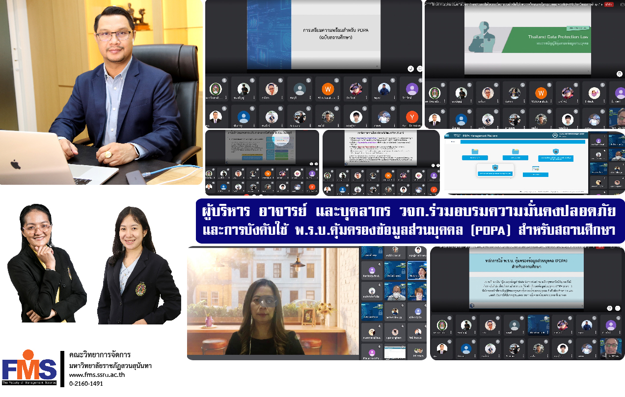 วันที่ 29 มีนาคม 2565 ผู้ช่วยศาสตราจารย์ ดร.สมศักดิ์ คล้ายสังข์ คณบดีคณะวิทยาการจัดการ พร้อมด้วยอาจารย์ และบุคลากรสายสนับสนุนวิชาการประจำคณะ เข้าร่วมโครงการอบรมความมั่นคงปลอดภัย และการบังคับใช้ พ.ร.บ. คุ้มครองข้อมูลส่วนบุคคล (PDPA) สำหรับสถานศึกษา จัดโดยศูนย์เทคโนโลยีสารสนเทศ สำนักวิทยบริการและเทคโนโลยีสารสนเทศ มหาวิทยาลัยราชภัฏสวนสุนันทา ผ่านระบบออนไลน์ Google Meet
