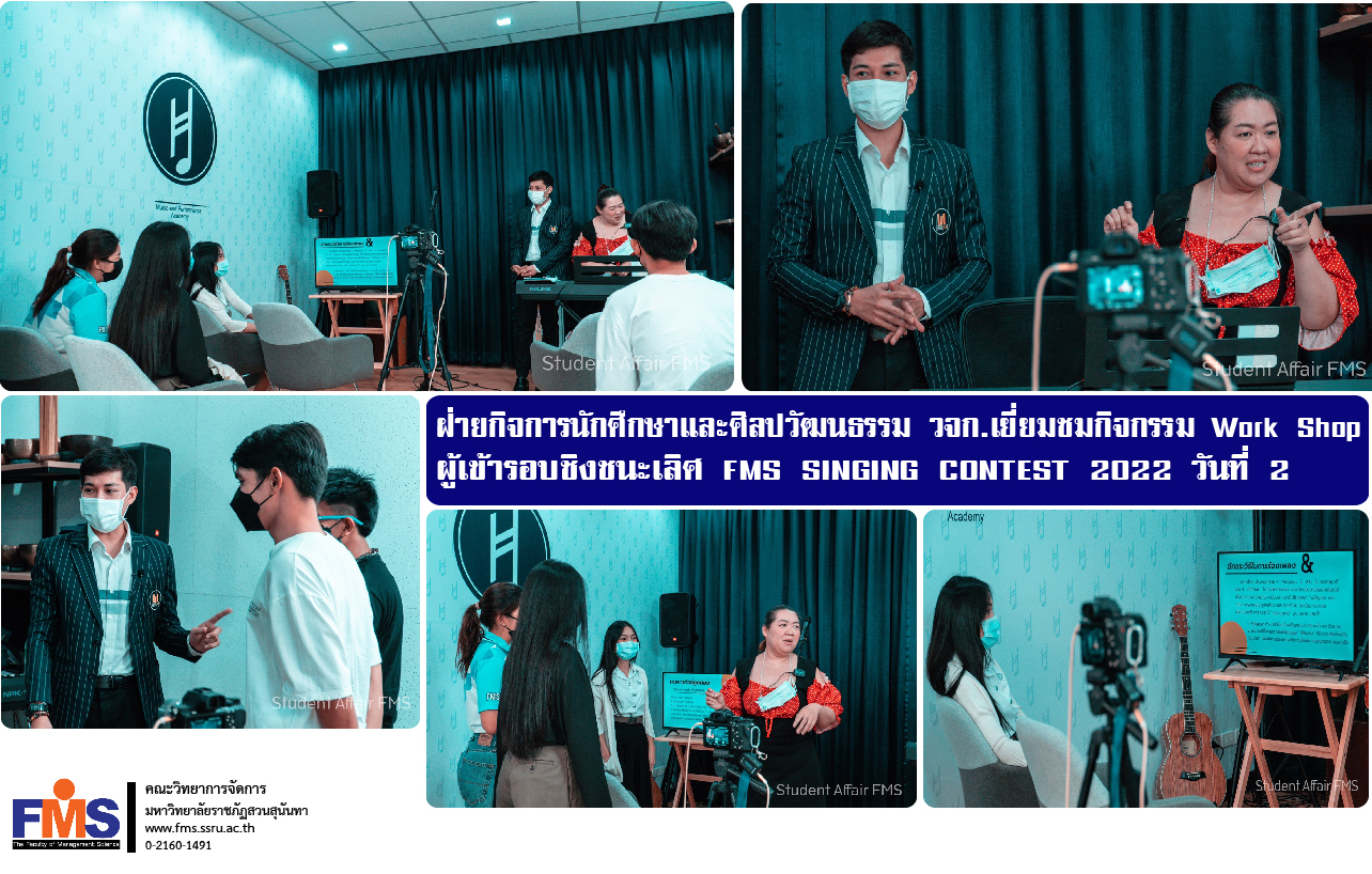 วันที่ 31 มีนาคม 2565 ฝ่ายกิจการนักศึกษาและศิลปวัฒนธรรม คณะวิทยาการจัดการ พร้อมด้วยคุณภัทรเดช ทรงสิริวรกุล กรรมการบริหาร กลุ่มบริษัท บริดจ์ ไนน์ จำกัด เยี่ยมชมกิจกรรม Work Shop ผู้เข้ารอบชิงชนะเลิศ การแข่งขันประกวดร้องเพลง ระดับอุดมศึกษาแห่งประเทศไทย ครั้งที่ 2 ประจำปี 2565 FMS SINGING CONTEST 2022 ประเภทเพลงไทยลูกทุ่ง วันที่ 2 โดยได้รับเกียรติจากคุณธีรพัฒน์ เจียรพงษ์ (ครูป้อม) ผู้บริหารสถาบันสอนร้องเพลง Harmony Music Academy ให้การต้อนรับ ณ Harmony Studio