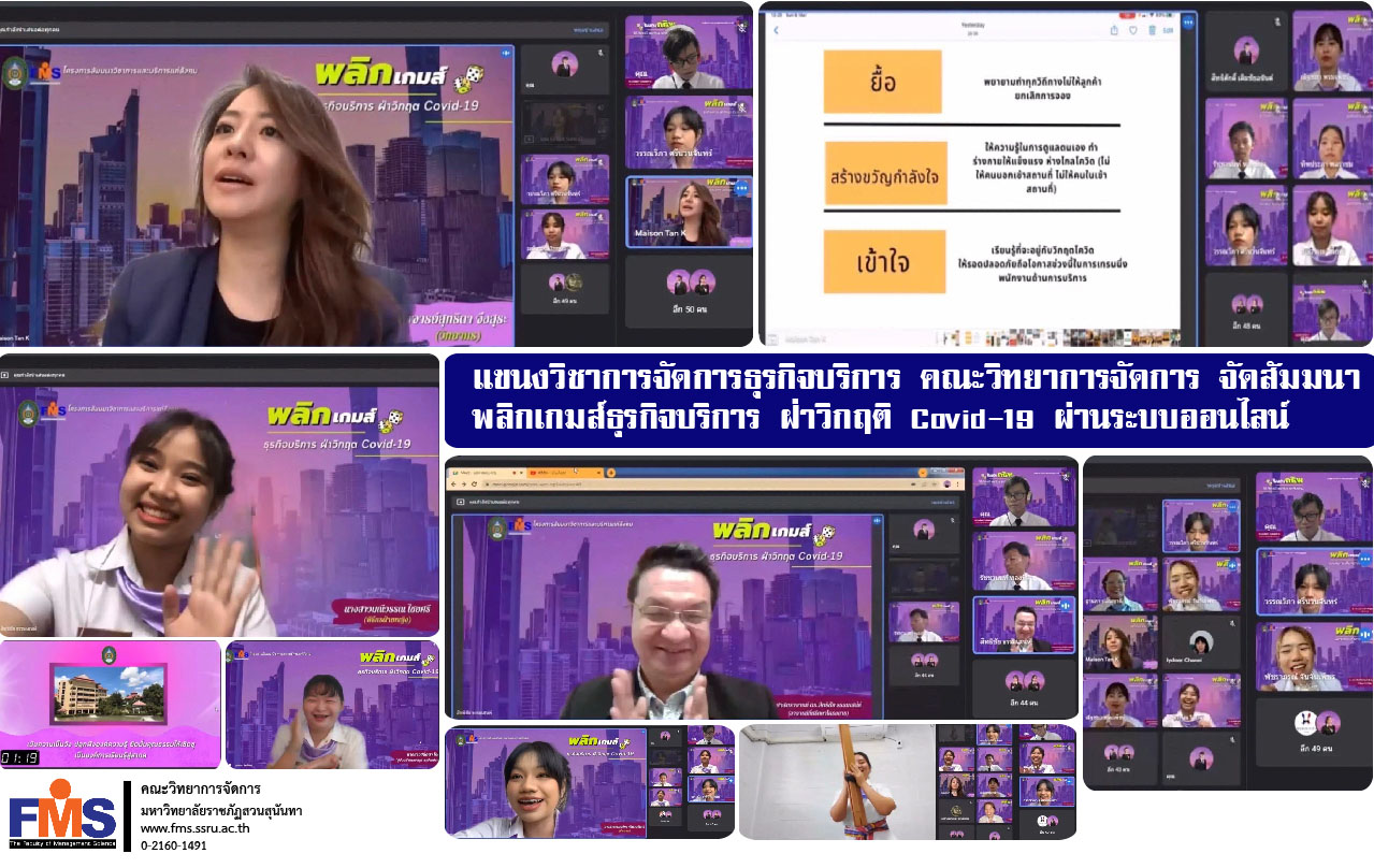 นักศึกษาแขนงวิชาการจัดการธุรกิจบริการ ชั้นปีที่ 3 หมู่เรียน 001 (กลุ่ม 3) คณะวิทยาการจัดการ ได้จัดโครงการสัมมนาวิชาการและบริการแก่สังคม ในหัวข้อเรื่อง “พลิกเกมส์ธุรกิจบริการ ฝ่าวิกฤติ Covid-19“ ผ่านระบบออนไลน์ โดยได้รับเกียรติจากอาจารย์สุทธิดา จึงสุระ เป็นวิทยากรถ่ายทอดความรู้และแลกเปลี่ยนประสบการณ์แก่สัมมนาสมาชิก โดยท่านได้ให้ข้อคิดที่ว่า “ในสภาวะวิกฤติ ธุรกิจต่างได้รับผลกระทบแต่ถึงกระนั้นก็ยังมีโอกาสที่ทำให้เราได้กลับมามองธุรกิจตัวเอง ในการวิเคราะห์ปัญหาและหาทางปรับปรุง เพื่อเตรียมรับมือกับลูกค้าในอนาคต” สำหรับการจัดสัมมนาดังกล่าวได้บรรลุตามวัตถุประสงค์ โดยมีผู้ช่วยศาสตราจารย์ ดร.สิทธิชัย ธรรมเสน่ห์ เป็นอาจารย์ที่ปรึกษาโครงการ