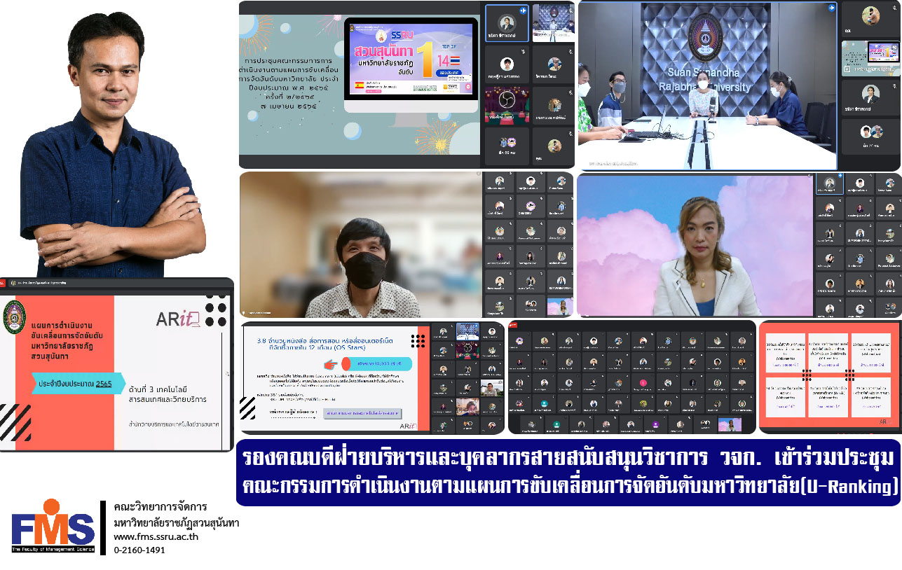 วันที่ 7 เมษายน 2565 เวลา อาจารย์ปิติมนัส บรรลือ รองคณบดีฝ่ายบริหาร คณะวิทยาการจัดการ พร้อมด้วยนากฤษณ์ปกรณ์ บุญมา นักวิชาการคอมพิวเตอร์ และนางสาวกันยากร สุจริตเนติการ นักประชาสัมพันธ์ เข้าร่วมประชุมคณะกรรมการดำเนินงานตามแผนการขับเคลื่อนการจัดอันดับมหาวิทยาลัย (U-Ranking) ประจำปีงบประมาณ พ.ศ. 2565 จัดโดยสำนักวิทยบริการและเทคโนโลยีสารสนเทศ โดยผู้ช่วยศาสตราจารย์ ดร.ศิริลักษณ์ เกตุฉาย ผู้อำนวยการสำนักวิทยบริการและเทคโนโลยีสารสนเทศ เป็นประธานการประชุม เพื่อชี้แจงผลการดำเนินงาน และการขับเคลื่อนการดำเนินงานรอบ 7-12 เดือน (เมษายน - กันยายน 2565) ตามตัวชี้วัด 3.1.1 ร้อยละความสำเร็จของแผนการจัดอันดับมหาวิทยาลัย ด้านที่ 3 ด้านเทคโนโลยีสารสนเทศและวิทยบริการ ประจำปีงบประมาณ พ.ศ. 2565 ในรูปแบบการประชุมออนไลน์ ผ่านโปรแกรม Google Meet