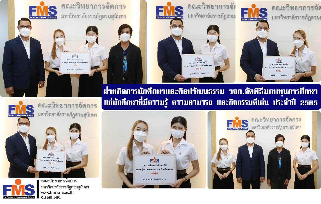 วันที่ 11 พฤษภาคม 2565 เวลา 11.30 น. ฝ่ายกิจการนักศึกษาและศิลปวัฒนธรรม คณะวิทยาการจัดการ มหาวิทยาลัยราชภัฏสวนสุนันทา จัดพิธีมอบทุนแก่นักศึกษาที่มีความรู้ ความสามารถ และกิจกรรมดีเด่น ประจำปี 2565 โดยได้รับเกียรติจากผู้ช่วยศาสตราจารย์ ดร.สมศักดิ์ คล้ายสังข์ คณบดีคณะวิทยาการจัดการ เป็นประธานในการมอบทุนพร้อมกล่าวแสดงความยินดีและให้โอวาทแก่นักศึกษาที่ได้รับทุน และพร้อมกันนี้อาจารย์ ดร.พงศวีร์ สุภานนท์ รองคณบดีฝ่ายกิจการนักศึกษาและศิลปวัฒนธรรม ร่วมเป็นเกียรติและยินดีแก่นักศึกษาที่ได้รับทุนดังกล่าว ณ สำนักงานคณบดีคณะวิทยาการจัดการ อาคาร 56
