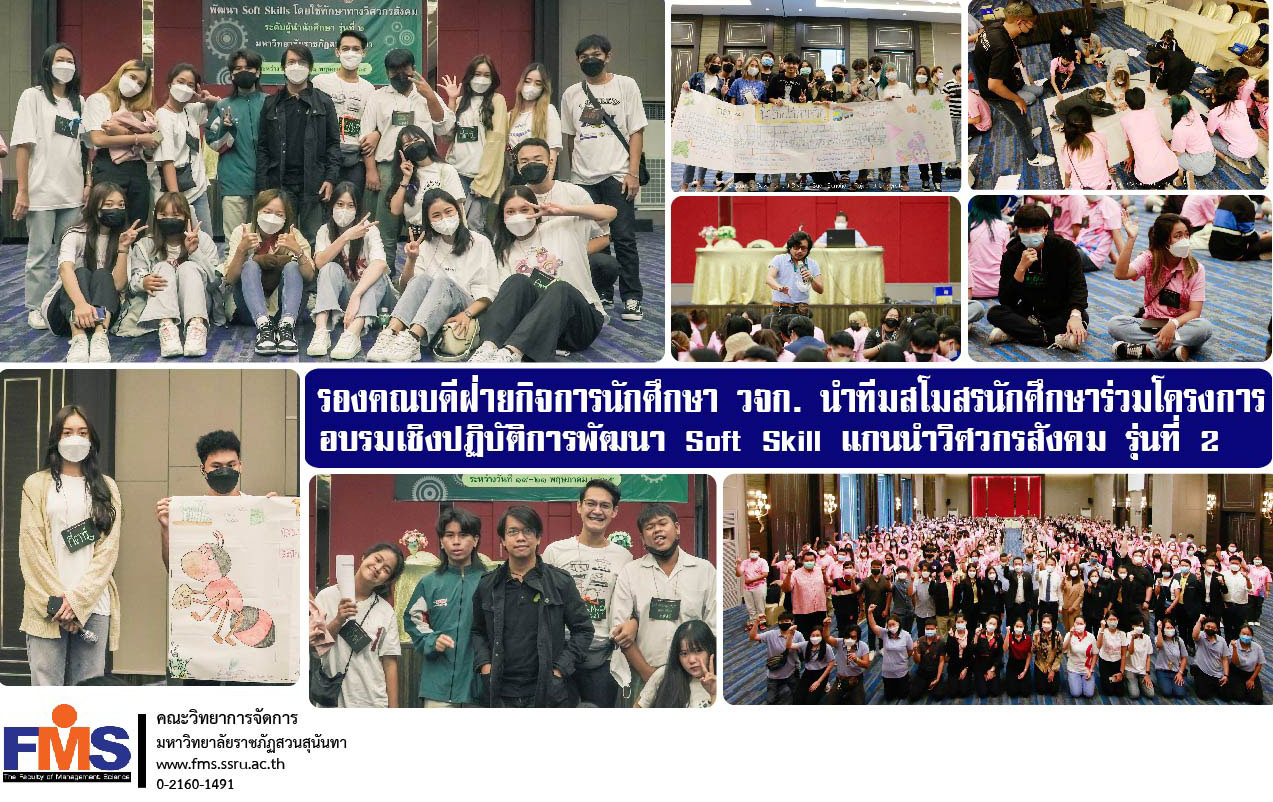 เมื่อวันที่ 19-21 พฤษภาคม 2565 อาจารย์ ดร.พงศวีร์ สุภานนท์ รองคณบดีฝ่ายกิจการนักศึกษาและศิลปวัฒนธรรม คณะวิทยาการจัดการ มหาวิทยาลัยราชภัฏสวนสุนันทา พร้อมด้วยบุคลาฝ่ายกิจการนักศึกษาฯ นำทีมสโมสรนักศึกษาคณะวิยาการจัดการ เข้าร่วมโครงการอบรมเชิงปฏิบัติการพัฒนา Soft Skill แกนนำวิศวกรสังคม รุ่นที่ 2 โดยมีผู้ช่วยศาสตราจารย์ ดร.เจตน์สฤษฎิ์ อังศุกาญจนกุล รองอธิการบดีฝ่ายกิจการนักศึกษา เป็นประธานเปิดโครงการ ซึ่งโครงการดังกล่าวเป็นกิจกรรมการอบรมให้ความรู้ Soft Skill แกนนำวิศวกรสังคม ระดับผู้นำนักศึกษา รุ่นที่ 2 เพื่อฝึกทักษะให้นักศึกษามีพื้นฐานของการเป็นวิศวกรสังคม, การแยกแยะ Objective Data และ Subjective Data และการวิเคราะห์เหตุ-ผล ฯลฯ มีผู้แทนสโมสรนักศึกษาแต่ละคณะ เข้าร่วมโครงการและกิจกรรมดังกล่าว ณ โรงแรมโกล์เดน ซี หัวหิน จังหวัดประจวบคีรีขันธ์
