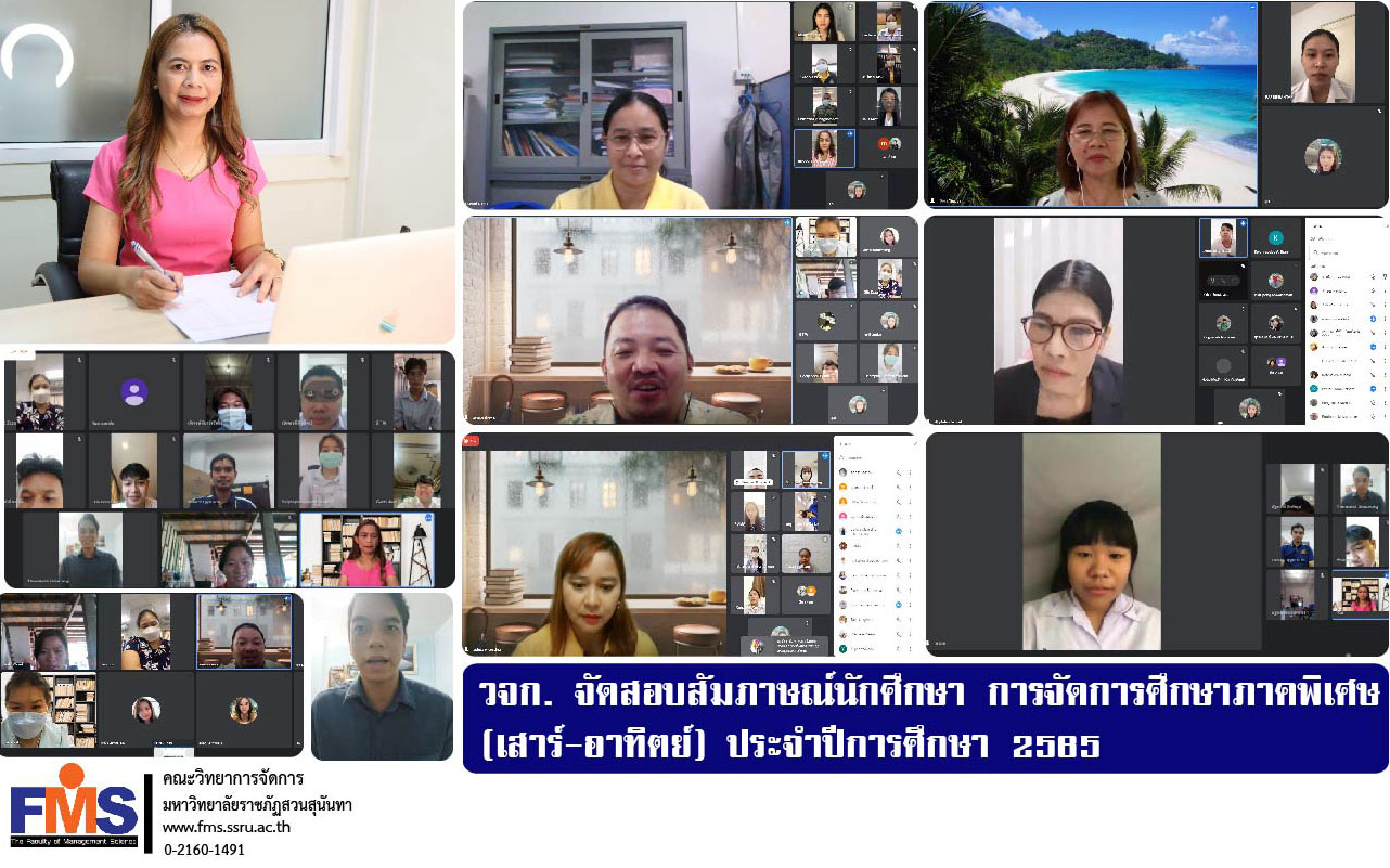 วันที่ 31 พฤษภาคม 2565 คณะวิทยาการจัดการ มหาวิทยาลัยราชภัฏสวนสุนันทา ดำเนินการจัดสอบสัมภาษณ์คัดเลือกบุคคลเข้าศึกษา การจัดการศึกษาภาคพิเศษ (เสาร์-อาทิตย์) ประจำปีการศึกษา 2565 ประกอบด้วย สาขาวิชาการบัญชี แขนงวิชาการตลาด แขนงวิชาการบริหารทรัพยากรมนุษย์ แขนงวิชาการจัดการธุรกิจบริการ ผ่านระบบออนไลน์ ซึ่งการสอบสัมภาษณ์ผ่านไปด้วยดี มีผู้สมัครเข้าศึกษาอย่างต่อเนื่อง