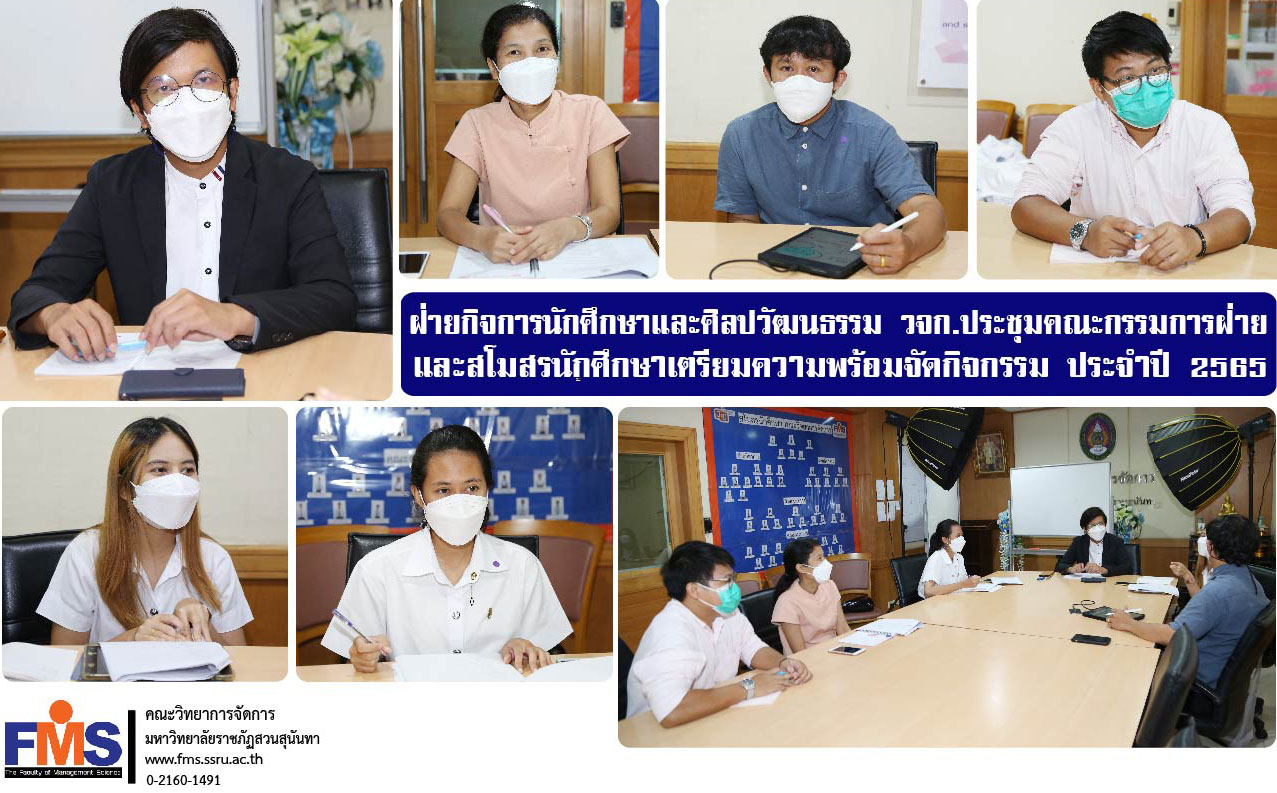 วันที่ 31 พฤษภาคม 2565 ฝ่ายกิจการนักศึกษาและศิลปวัฒนธรรม คณะวิทยาการจัดการ มหาวิทยาลัยราชภัฏสวนสุนันทา จัดประชุมคณะกรรมการฝ่ายกิจการนักศึกษาและศิลปวัฒนธรรมและสโมสรนักศึกษาคณะวิทยาการจัดการ โดยอาจารย์ ดร.พงศวีร์ สุภานนท์ รองคณบดีฝ่ายกิจการนักศึกษาและศิปวัฒนธรรม เป็นประธานการประชุม เพื่อเตรียมความพร้อมแผนการจัดกิจกรรม ประจำปีงบประมาณ พ.ศ. 2565 มีคณะกรรมการฝ่ายกิจการนักศึกษาและศิลปวัฒนธรรมและผู้แทนนักศึกษาสโมสรนักศึกษาประจำคณะ เข้าร่วมประชุม ณ ห้องประชุมสโมสรนักศึกษา คณะวิทยาการจัดการ