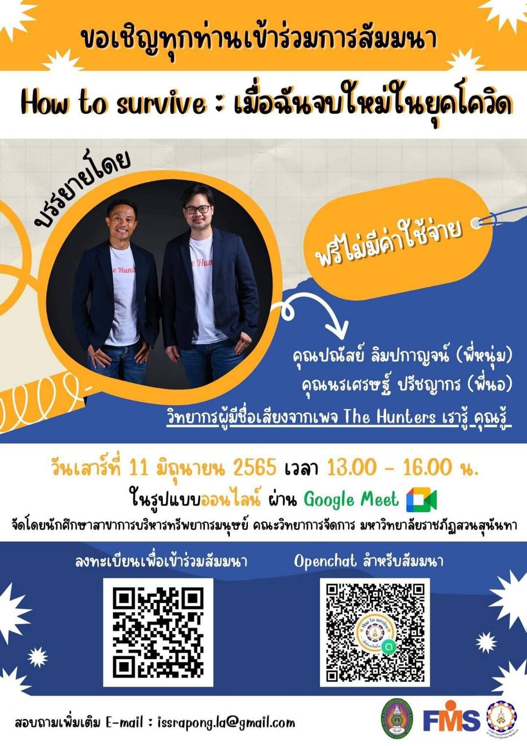 แขนงวิชาการบริหารทรัพยากรมนุษย์ คณะวิทยาการจัดการ ขอเชิญผู้สนใจเข้าร่วมงานสัมมนาหัวข้อ "How to survive : เมื่อฉันจบใหม่ในยุคโควิด" สำหรับผู้ที่มีความสนใจเกี่ยวกับการเตรียมความพร้อมในการสมัครงานในช่วงสถานการณ์การแพร่ระบาดของไวรัสโควิด-19