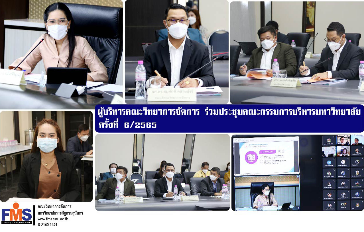 วันที่ 13 มิถุนายน 2565 เวา 09.30 น. ผู้ช่วยศาสตราจารย์ ดร.สมศักดิ์ คล้ายสังข์ คณบดีคณะวิทยาการจัดการ พร้อมด้วยนางสาวจิณห์จุฑา ศรีเหรา หัวหน้าสำนักงานคณบดีคณะวิทยาการจัดการ เข้าร่วมประชุมคณะกรรมการบริหารมหาวิทยาลัย ครั้งที่ 6 /2565 มีคณะผู้บริหารมหาวิทยาลัย คณะ หน่วยงาน วิทยาเขต ศูนย์การศึกษา เข้าร่วมประชุม ณ ห้องประชุมสภามหาวิทยาลัย อาคาร 31 ชั้น 5 และการประชุมออนไลน์ด้วยโปรแกรม Google Meet